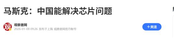 美国竟怕这个!2026年1月7日,马斯克抛出惊人言论!原来美国不畏惧中国的航空母舰,也不怕中国的核武器,怕的是…… 近年来美国针对我国,在多领域展开了制裁。本以为是因为我国的军事实力得到增加,但实则并不全是。 美国其实并不怕我国的航空母舰,也不怕我国的核武器。毕竟美国也有着强悍的军事实力,我国有核武器,美国自然也有,而且美国的核武器还经过“实战”。 所以军事实力并不是美国针对我国展开制裁的全部原因,美国之所以会对我国展开制裁,更多的因素在于我国的芯片发展。不知大家是否发现?在近年来的制裁中,美国的主要制裁对象就是芯片。 美国之所以会对我国芯片展开制裁,其目的就是为了维护科技霸权。但是美国真的能够实现这一目的吗? 就在2026年1月7日的时候,据美国媒体报道,马斯克在一档节目中明确表示,中国将拥有比其他任何国家都更多的电力,也会拥有更多的芯片。 所以中国的芯片发展是美国阻挡不住的,而根据相关媒体的报道,在2026年的时候,我国的国产芯片将在部分场景实现规模化应用。所以美国针对我国的制裁,从来都没有限制住我国的发展,反而进一步的激励了我国的发展潜力。 现如今芯片是数字经济,AI等科技领域发展的核心。一旦我国在芯片方面超过美国,也就意味着,我国将会成为科技发展的主导。对于这一点,美国自然是无法接受,更不会允许。 对此,您怎么看?欢迎评论区留言您的看法,我们一起讨论一下。 (信息来源:中国芯(中国自主研发并生产制造的计算机处理芯片)-百度百科) (信息来源:马斯克:中国能解决芯片问题-观察者网)
