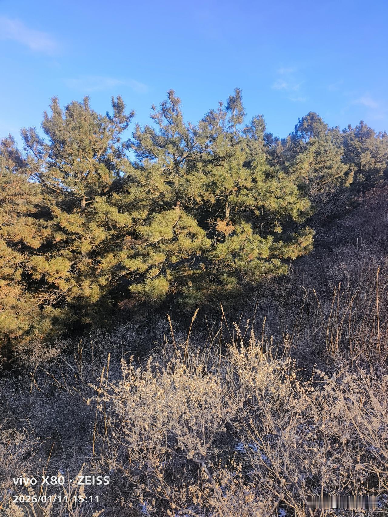 松树的青绿,荆条的枯黄,这就是北方冬天的服装,天苍苍,野茫茫,冷飕飕,暖洋洋!