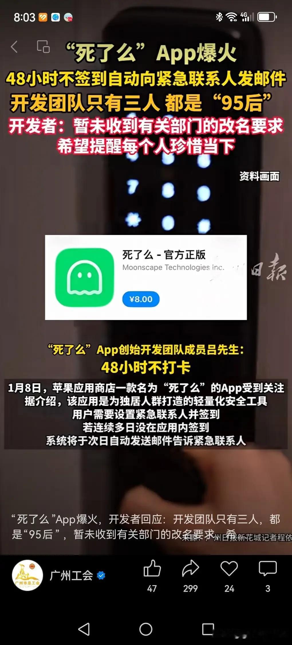 太离谱了!劝退无数人的“死了么”APP突然爆火! 专为独居老人设计,年轻人抢着下载,多日不签到就给紧急联系人发邮件,可惜的是只在苹果商店上线。网友:改名叫“活着么”能再火十倍! 这款APP能火一点都不意外,背后藏着的是当下越来越多人的“独居焦虑”,尤其是独居老人们的日常,满是说不出口的小心和无奈。 楼下的张大爷,七十出头的年纪,子女都在外地工作,一年到头也回不来几次。他每天的生活轨迹特别固定,早上六点多起床,收拾好自己,拎着布袋子去菜市场买当天的菜,挑挑拣拣,就为了省那几块钱。 回家煮碗粥配咸菜,坐在阳台的小马扎上,眯着眼晒太阳,手里攥着老年机,时不时亮一下屏幕,就盼着子女能打个电话过来。 最怕的就是夜里生病,有次他起夜摔了一跤,扶着墙半天站不起来,愣是咬着牙撑到天亮,才敢给儿子打视频,怕孩子们担心,还特意装作没事人一样。 张大爷听邻居说过这款“死了么”APP,说能给子女报平安,他也动过心思,转头却发现自己用的是子女淘汰下来的安卓手机,根本搜不到这个应用。 有意思的是,这款APP的开发团队是三个95后,开发成本才1000多块,上线没几天付费人数就翻了200倍,甚至还催生出了同类免费APP“活着么”。但年轻人抢着下载的同时,真正需要它的独居老人们却被拦在了门外。 社区里组织过手机教学课,教老人们用微信视频、发定位,张大爷去了两次就不去了,老花眼盯着屏幕费劲,手指头也不听使唤,点半天都点不准签到按钮。 更让人哭笑不得的是它的核心功能,全靠用户主动签到,连续两天不签才给紧急联系人发邮件。可真遇到突发情况,比如老人跌倒、突发心梗,谁还有力气去点手机? 邮件通知也特别鸡肋,现在年轻人谁还天天盯着邮箱看?有网友就吐槽,自己加班忘了签到,让朋友收到邮件,等看到的时候已经过了大半天,白白担了一场心。 这款APP的火爆,更像一场社会焦虑的集中爆发。它暴露了我们对独居群体安全保障的缺失,却没能真正解决问题。名字太轻浮,让本该严肃的安全工具少了人文关怀;功能太单一,没法应对突发状况。 多考虑考虑老人的使用习惯,把名字改得温和点,加上短信、电话双重提醒,尽快推出安卓版本,这些都是能立刻优化的地方。毕竟对独居的老人来说,这不是一款普通的APP,而是关键时刻能救命的稻草。 各位读者你们怎么看?欢迎在评论区讨论。