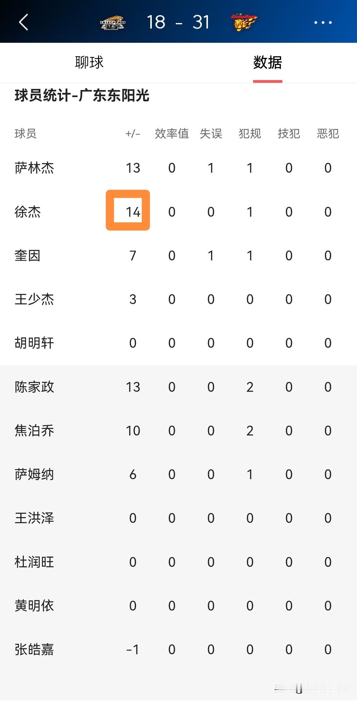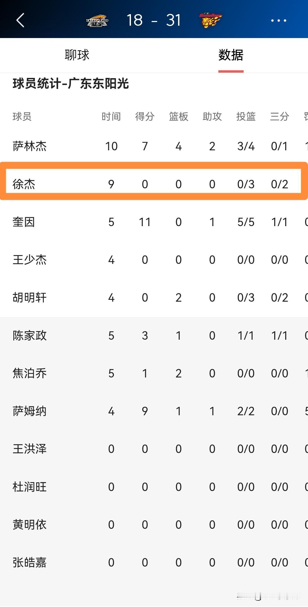 广东东阳光超级球星徐杰真是太让人费解了!在今天广东东阳光客场挑战辽宁本钢的比赛中,目前双方的第一节比赛已经结束,广东东阳光以31:18领先对手。让人感到非常费解的是,在第一节比赛中,虽然徐杰首发出战9分钟,投篮3中0怒砍0分0篮板0助攻,但是他的场上正负值却是全队最高的+14。 对此,我真是百思不得其解,徐杰在颗粒无收的情况下是怎么做到场上正负值全队最高的?