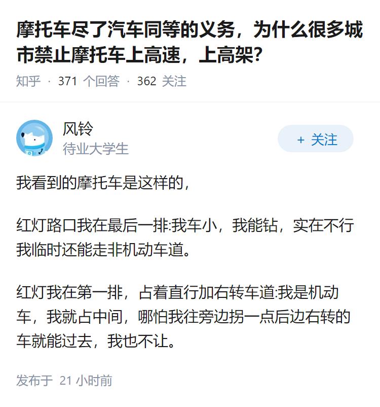 摩托车尽了汽车同等的义务,为什么很多城市禁止摩托车上高速,上高架?