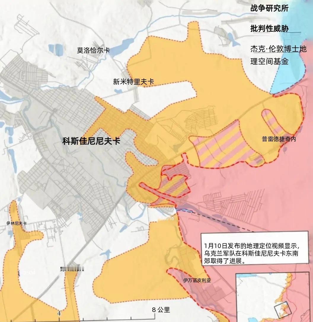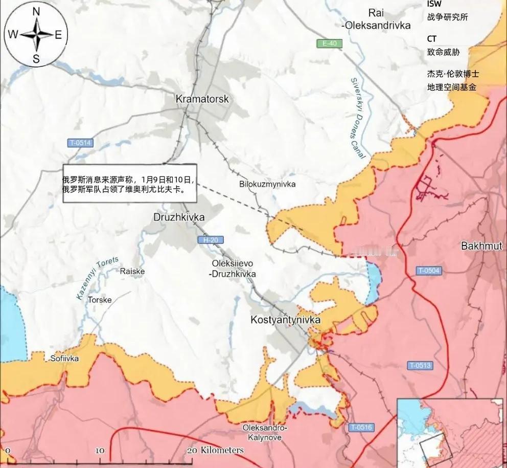 决战双子城之外围争夺:乌军在南翼进行反攻 在莱曼西北方向,俄军率先发起渗透作战。1月9日公开的地理定位视频显示,两名俄军士兵在莱曼西北的亚罗瓦东西部区域活动,据美国战争研究所认为,此次行动属于俄军渗透任务,但并未改变该区域的地形控制权及战场前沿态势。 俄军军事博主声称,俄军在斯维亚托希尔西克东部、奥泽尔内中部及帕泽诺北部等区域实现推进,但此类说法尚未得到地理定位信息证实。 1月10日,乌克兰国民警察通报称,俄军对斯拉维扬斯克发动FAB-250滑翔炸弹袭击,造成7人受伤及多处民用基础设施损毁,该型炸弹具备60-80公里最大滑翔距离与20米内命中精度,已成为俄军远程打击的主力装备之一。 作为“双子城”外围的核心争夺点,康斯坦丁诺夫卡周边战场成为乌军反攻的主阵地。1月10日公开的地理定位视频显示,俄军第4摩托化步兵旅(第3合成集团军,南部军区)对康斯坦丁诺夫卡南郊的乌军部队发动打击,这一行动间接证实乌军近期已在该区域实现战术推进,成功突破俄军部分前沿阵地。 与此同时,俄军多支部队在该方向的作战部署得到地理定位信息验证:第1442摩托化步兵团(第6摩托化步兵师,第3集团军,受南部集团军群作战指挥)在康斯坦丁诺夫卡东部的斯图波奇基西北及市区东部打击乌军阵地,第103摩托化步兵团(第150摩托化步兵师,第8合成集团军,南部军区)则在普莱希夫卡西北部展开攻势,而这些区域此前均被俄方声称处于其控制之下。 俄军军事博主针对康斯坦丁诺夫卡方向发布了多项未经证实的推进声明,包括占领该市北部的维罗柳比夫卡,但随后有博主更正称,俄军未能巩固该定居点控制权,乌军已重新夺回该区域。在该市北部的新德米特里夫卡、东部的普雷德泰奇内、南部的贝雷斯托克及西北部的伊利尼夫卡等区域,俄方博主的推进声称与乌军仍保持控制权的说法相互矛盾,其中克里姆林宫关联博主明确指出,俄军对贝雷斯托克和伊利尼夫卡的攻击报道尚不成熟。此外,俄方还声称在康斯坦丁诺夫卡东部、波迪尔斯克南部、斯廷基南部等多个外围据点实现推进,但均未获得独立信源证实。 在实际战场行动中,俄军于1月9日至10日对康斯坦丁诺夫卡及其周边展开全域攻击,覆盖北部的维罗柳比夫卡、东北部的明基夫卡、新马尔科韦、米哈伊洛夫卡、迈斯克、东部的斯图波奇基、东南部的亚历山德罗-舒尔京内、南部的普莱希夫卡等10余个据点,甚至延伸至德鲁日基夫卡南部及西南部的索菲伊夫卡方向。乌军则在明基夫卡附近发起反击,暂时遏制了俄军的推进势头。值得注意的是,关于迈斯克的控制权存在明显信息分歧:克里姆林宫关联博主称俄军近期才实际占领该据点,但俄国防部早在2025年9月就已宣布夺取该定居点,部分俄军博主还透露,康斯坦丁诺夫卡方向存在多项关于俄军占领定居点的虚假报道。 乌军方面,克拉马托尔斯克方向某作战旅发言人1月10日透露,俄军善于利用恶劣天气条件(阻碍乌军无人机行动)加强攻击强度,且主要以5人以下小组在黄昏和夜间发动突袭。此外,俄军火炮伪装技术精湛,导致乌军在反炮兵作战中难以识别被打击火炮的具体型号,给战术反击带来较大困难。