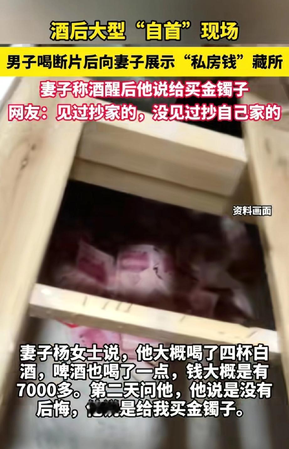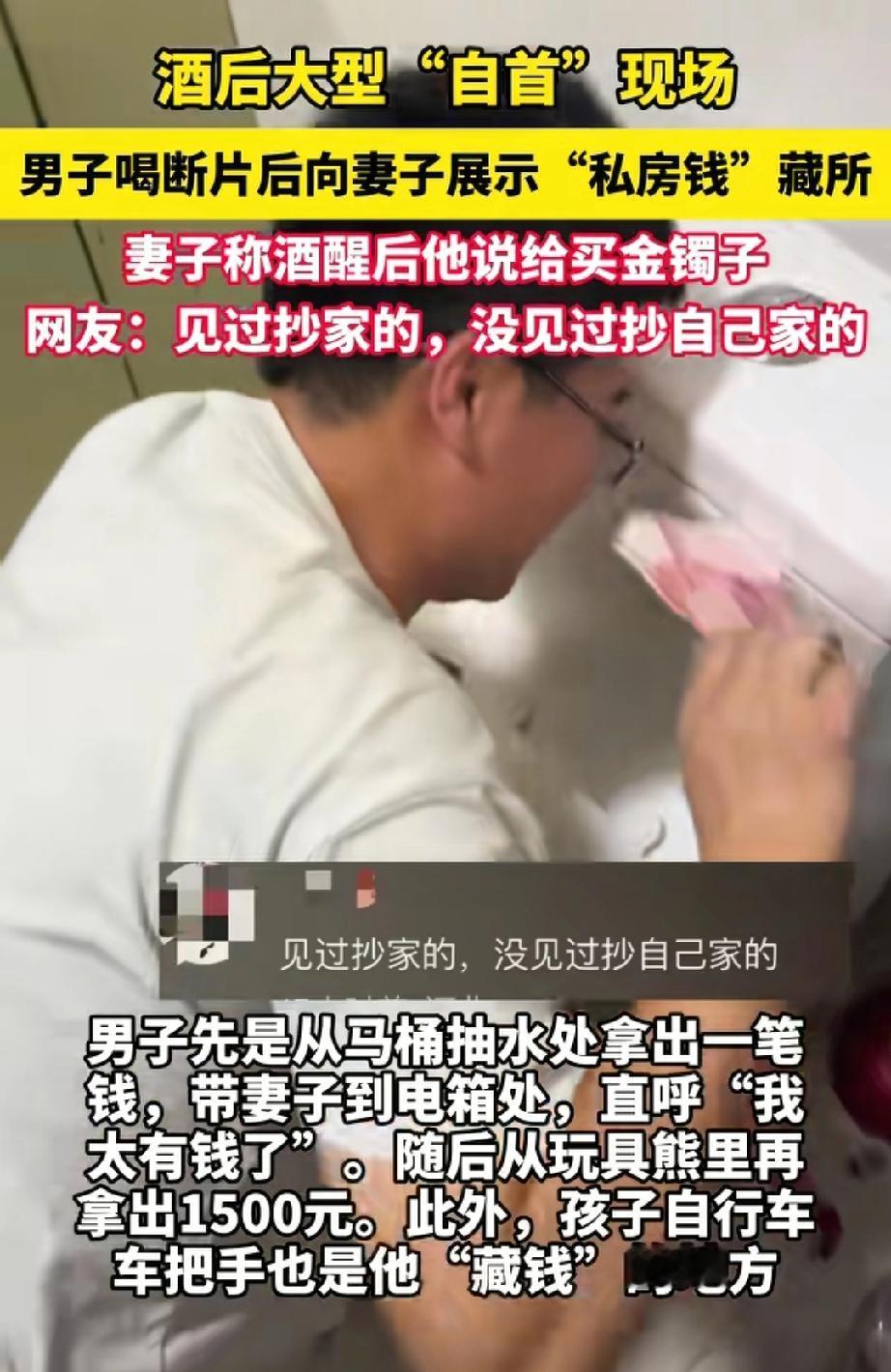 笑到岔气!”河北,一男子和朋友喝酒喝“断片”了,回家后竟然拉着妻子挨个翻出了自己藏了很久的私房钱,一边把钱往外掏,一边念叨着“我太有钱了”。妻子默默将这些钱收好,第二天找丈夫质问,丈夫:给你买金镯子的。网友:别人酒后吐真言,这哥们酒后办实事! 刘先生结婚后,为了家里开销戒了烟,酒也很少喝。这次因为朋友帮忙过买房,不好拒绝就去喝酒了,结果喝得酩酊大醉被送回家。 他拉着妻子开始“寻宝”:先从马桶抽水水箱里掏出一沓钱,接着跑到电箱处,直呼“我太有钱了”,又从玩具熊里拿出1500元,甚至孩子自行车车把里也藏了钱!把这些地方全翻遍后,总共找出7000多块。 第二天妻子拿着钱问他,他才说这些钱是戒烟戒酒后一点点攒的,就想圆结婚时给妻子买金镯子的梦,怕被没收才藏得这么隐蔽。 咱 “见过抄家的,没见过抄自己家的!这藏钱地点,贼来了都得懵!别人酒后吐真言,他酒后办实事,直接把老底儿交了!这哥们酒醒后估计得懵,自己把老底儿全揭了 男人婚后快乐真不多,戒烟戒酒攒点钱不容易,当老婆的得多关心关心。 我看完直接笑到拍大腿!这哥们藏钱藏得也太绝了,马桶、电箱、玩具熊全用上了,跟搞地下工作似的,结果一杯酒全招了! 但笑着笑着又觉得特暖,他攒钱不是为了自己潇洒,是想着给媳妇买金镯,这心意谁扛得住啊! 结婚后男人戒烟戒酒,偷偷攒钱,不就是想给家里多份惊喜嘛,这份担当和爱,真的绝了! 刘先生的私房钱不是“小金库”,是他想给妻子惊喜的小心思;妻子最后没责怪,反而心疼他的用心,这就是婚姻里的互相体谅。 婚姻里哪有那么多对错,不过是你想着我,我体谅着你。不管是管钱的还是攒钱的,多聊聊心里的想法,日子才能越过越暖。 就像这对夫妻,吵过笑过之后,还是把钱用到了更重要的地方,这就是商量着过日子的模样,多踏实!