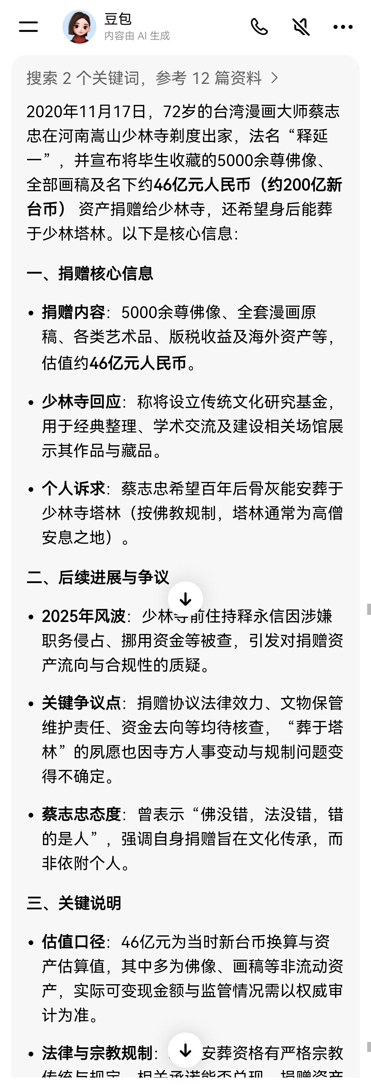 释永信因贪污和私生活问题被调查,知名漫画家蔡志忠曾捐赠巨额财产希望能在少林寺修行并安葬,却被释永信欺骗。