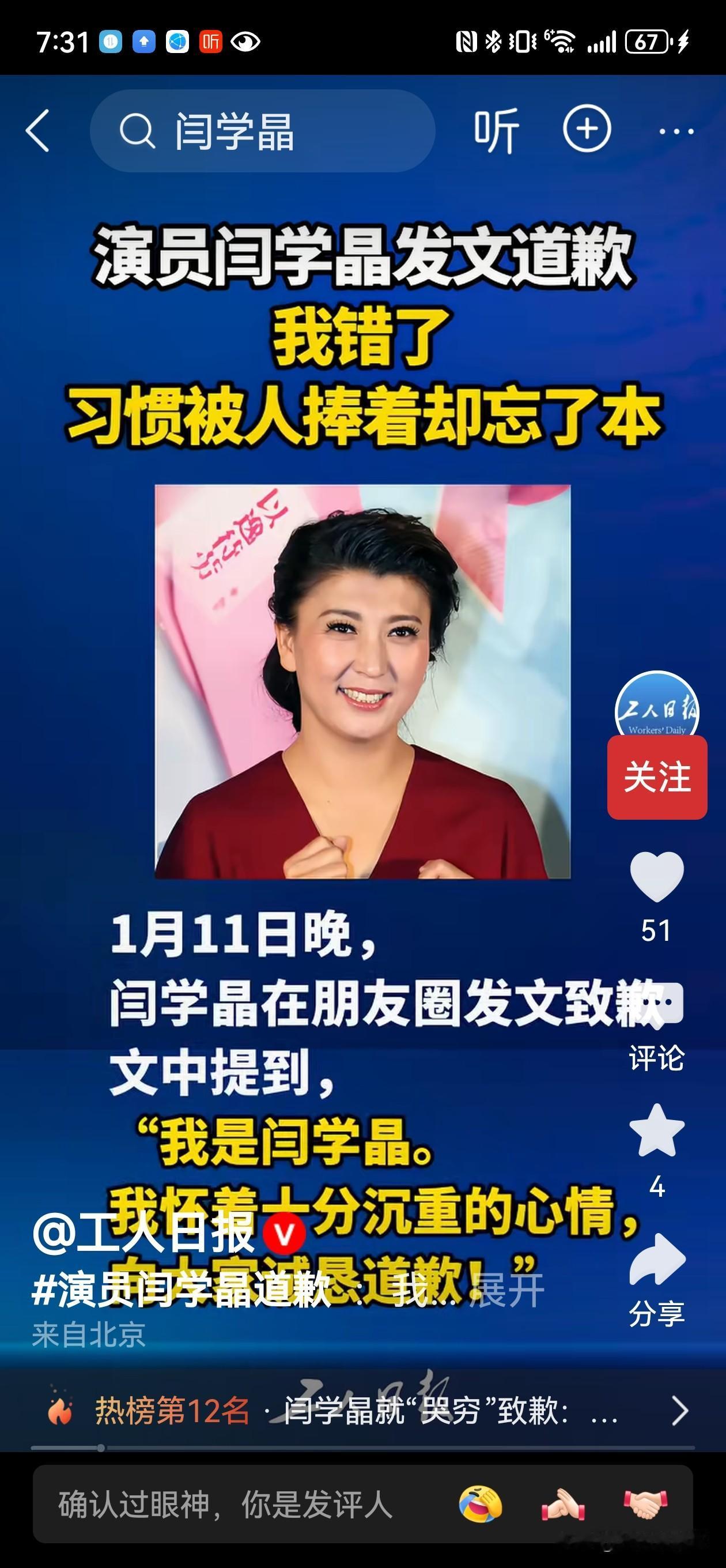 闫学晶的这份自白总感觉有些被逼无奈的东西在里面?这个能否抹平网友间理解与信任的这道鸿沟?她能否再回到从前那个闫学晶? 1月10日,她的抖音、快手等社交账号被禁止关注;次日,又遭品牌方终止代言合作。这一切,都源于她在直播中谈及儿子一家收入时所说的那句话——“就挣个几十万,无法维持家庭运转”。 这番言论迅速被贴上“哭穷”标签,引发众多网友不满,纷纷表示要抵制她代言的产品。与此同时,她此前有关“酸黄瓜”的争议言论也被重新翻出,进一步激化了公众情绪。 闫学晶的发言之所以触发如此强烈的舆论反弹,根源在于其背后折射出的认知错位——将特定圈层的生活标准,不自觉等同于普通人的生存现实。当“几十万年收入不够花”以如此自然的语气被说出时,她所参照的,早已是远离大众日常的另一种生活坐标。 表面看,这是一次明星“失言”引发的典型争议;但深入审视,事件背后实则是日益凸显的社会结构张力——精英阶层的话语逻辑与普通人的生存体验之间,已然出现难以弥合的感知鸿沟。 正如闫学晶在道歉信中所反思的:大家批评的并非只是“说错话”,更是“闫学晶怎么变成这样了”。她在信中写道:“我认真审视自己,发现这不是一句‘没说对’或‘没把握好’那么简单,而是我的思想出现了严重偏差。” 她回溯了自己的成长经历:“我从小在普通家庭长大,是父老乡亲和生活的烟火气哺育了我的艺术生命。我一直以为自己不会忘记,可时间久了、环境变了,听惯了掌声、捧惯了鲜花,慢慢习惯了被人捧着,却不知不觉忘了本。我见了更大的世面,却也将这当成了一种‘优越感’,丢掉了过去的自己。” 不尊重普通人、凌驾于生活烟火之上的人,终将被大众疏离甚至抛弃。公众人物尤其如此——不必因为脱贫致富,就自以为高人一等,甚至轻视底层百姓。常言道,往上数三代,谁家不是来自乡土民间。 这场风波不仅是一位演员的个人反思,更是一次社会心态的集体映照。在日渐复杂的社会结构中,如何保持对真实的敬畏、对普通人的共情,或许是每一个站在聚光灯下的人都需要持续修习的功课。