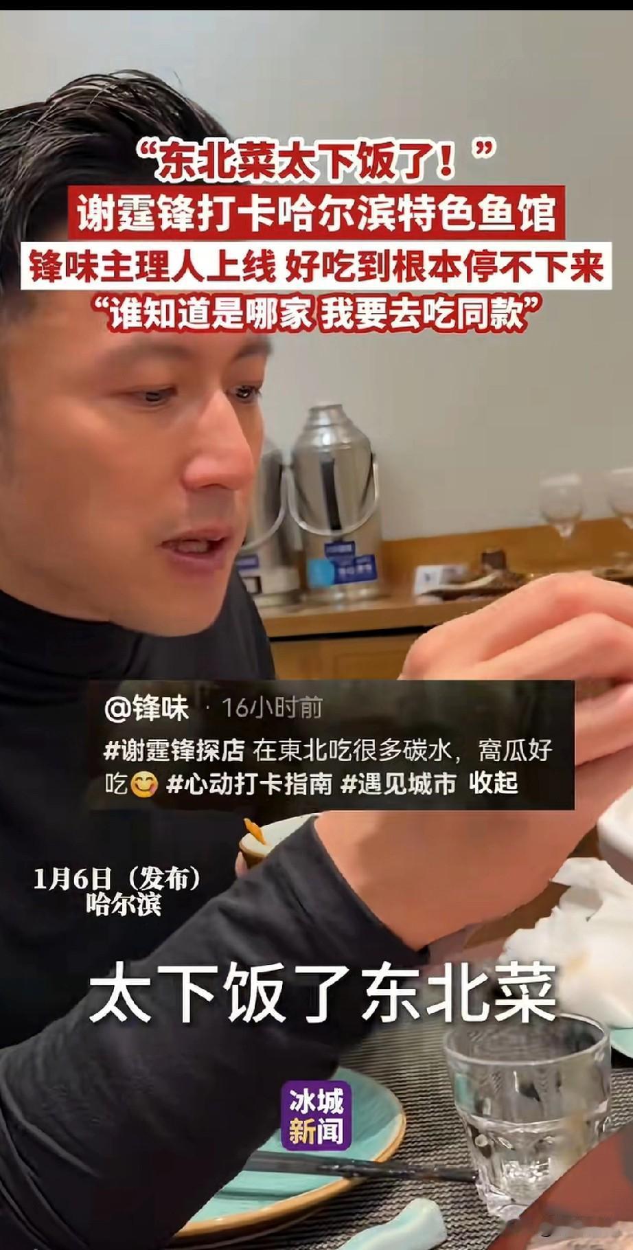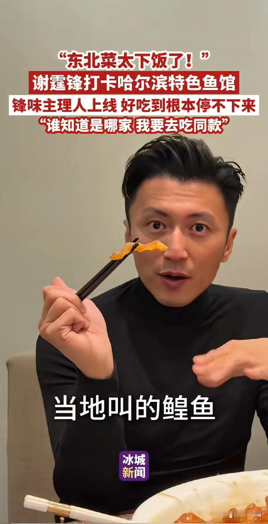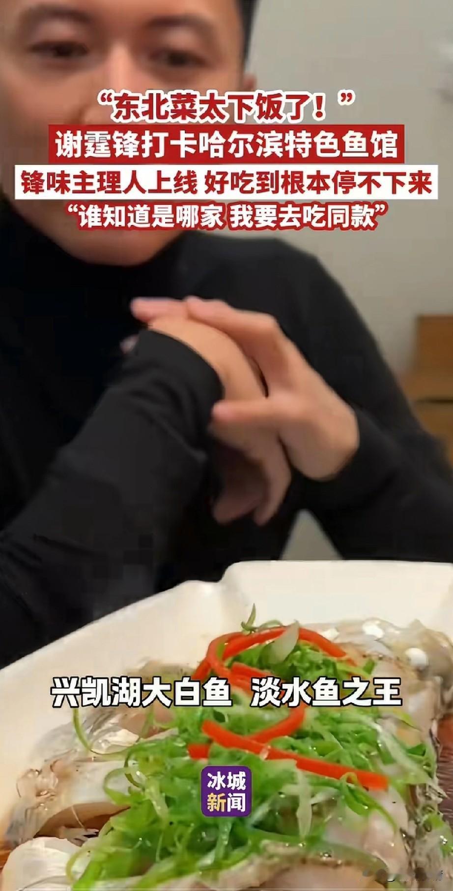 谢霆锋到东北哈尔滨鱼馆吃饭, 被眼前的美食都惊呆了, 看着鱼馆池子里养的鱼, 直接问服务员你们怎么会有这么大的鲟鱼,服务员告诉他这是乌苏里江深水圈养的鲟黄鱼! 随后谢霆锋就进入了包间, 一盘非常大的兴凯湖大白鱼, 号称淡水鱼之王, 看着如此精致的鱼, 谢霆锋都忍不住赶紧用汤汁浇了一下鱼,然后加了一大块儿鱼肉, 尝了之后说挺干净的, 而且非常的清新, 然后又看到了黄色的鱼, 他也夹了一块给观众展示, 表示这个是鳇鱼, 这个厨师的刀工很不错, 鱼肉吃起来也非常的爽滑, 看来东北这鱼馆的菜很合他的口味, 谢霆锋可是锋味主理人, 算是一个有厨师基本功的人了, 能做出这样的评价应该是很不错, 最后一盘和盆子一样大的大鸡炖蘑菇上来了,谢霆锋直接站了起来, 用两个筷子夹了一大口, 然后尝了尝,觉得太入味了, 最后的排骨和鸡爪子他也是赞不绝口, 网友都说谢霆锋这次吃爽了, 也有网友表示谢霆锋和平时不太一样, 美食当前,谁又能忍得住? 谢霆锋这次哈尔滨鱼馆之行, 也是非常的平易近人, 就像在香港生活一样自由, 这才是明星正常的状态, 那些动不动就封路推开路人的明星, 真当自己是大人物了! 大家喜欢谢霆锋这样的明星吗? 哈尔滨 谢霆锋