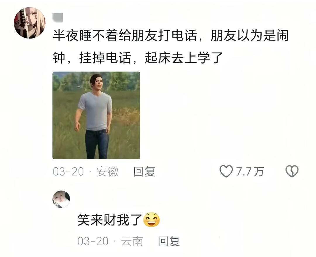 半夜睡不着给朋友打电话,朋友以为是闹钟,挂掉电话,起床去上学了
