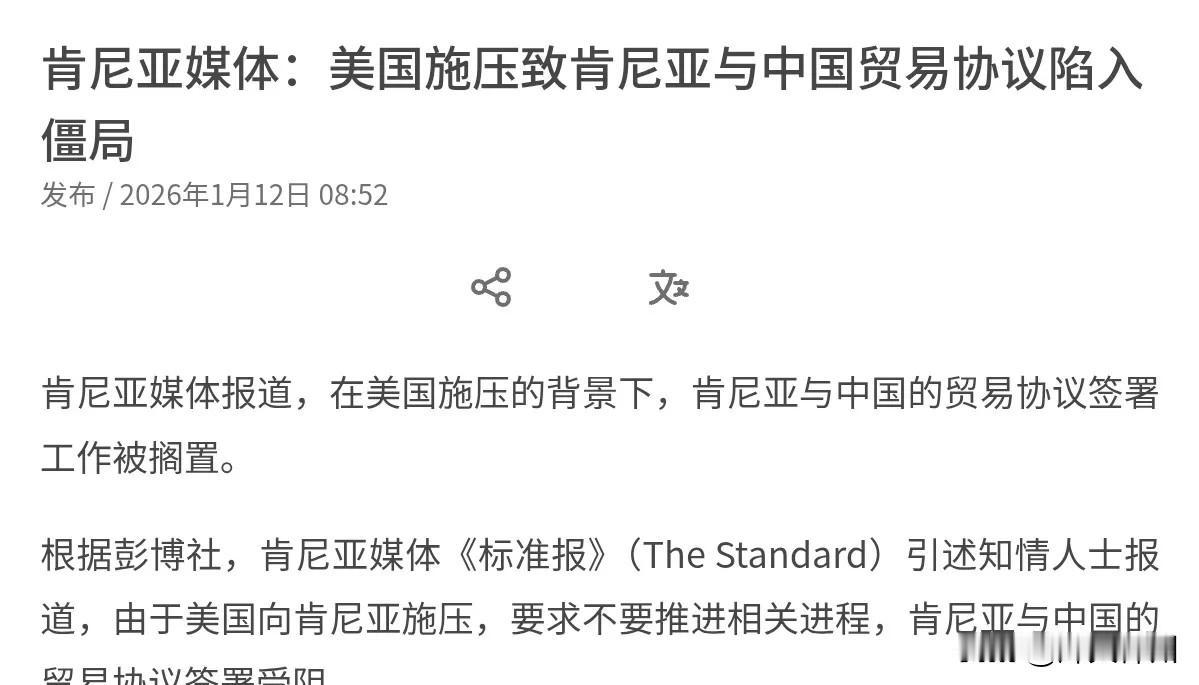 美国又搞霸权操作,逼肯尼亚在中美之间二选一 1月12日,根据外媒报道,外媒称,由于美国向肯尼亚施压,要求不要推进与中国相关合作的进程,肯尼亚与中国的贸易协议签署受阻。外媒表示,现在肯尼亚面临的是一个二选一的局面。一方面,肯尼亚正寻求延长其参与美国《非洲增长与机遇法案》的期限,该法案对部分输美商品实行关税减免,另一方面,面对与我们的经贸协议,美国明确对肯尼亚施加了压力。 评几句: 美国正强硬施压肯尼亚,要求其放弃推进与中国的经贸协议,否则就可能影响《非洲增长与机遇法案》期限延长,把肯尼亚架在“选美国还是选中国”的两难境地。 这绝非平等合作,而是赤裸裸的霸权施压!要知道,AGOA让肯尼亚输美商品享受关税减免,其纺织业曾借助这一法案实现显著创收,带动数万个就业岗位。但美国转头就拿这一福利当筹码,逼肯尼亚放弃能带来基础设施、零关税农产品出口的中肯合作,本质就是怕中非关系动摇其非洲霸权。 可美国打错了算盘!肯尼亚总统鲁托早已明确表态,深化对华关系是国家本意,符合自身最大利益。中肯合作给肯尼亚带来的是蒙内铁路这样的民生工程、大批就业岗位,还有不附加政治条件的务实支持,这是美国的霸权施压换不来的。