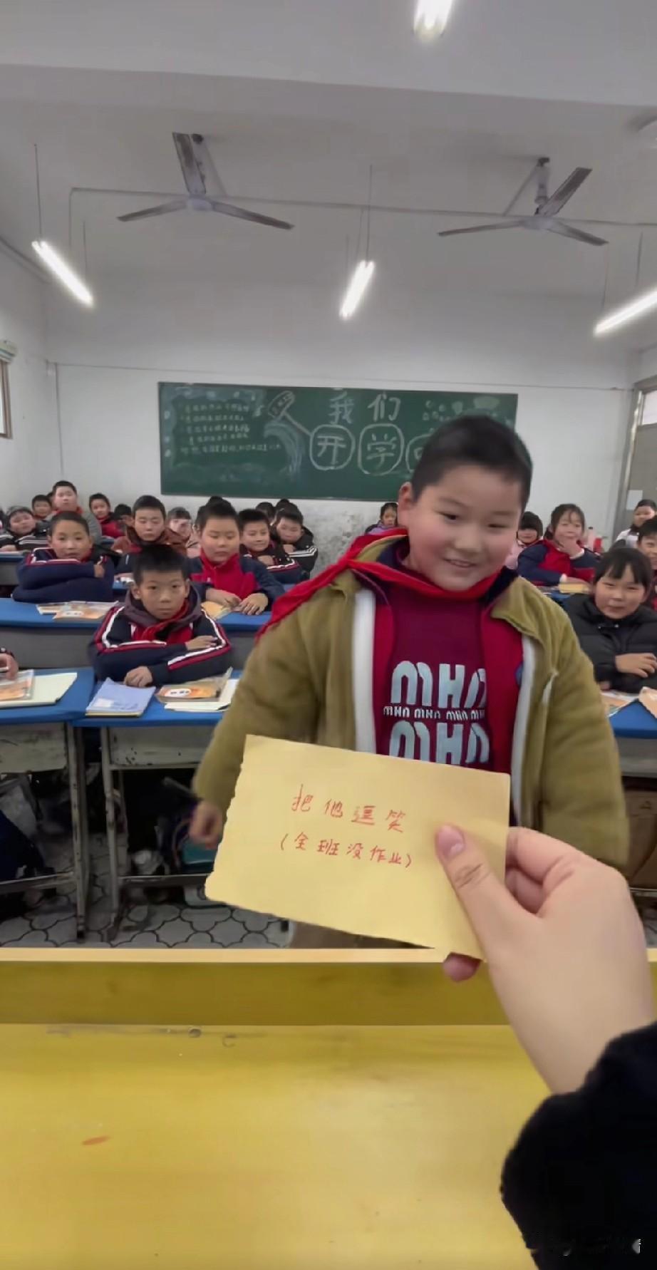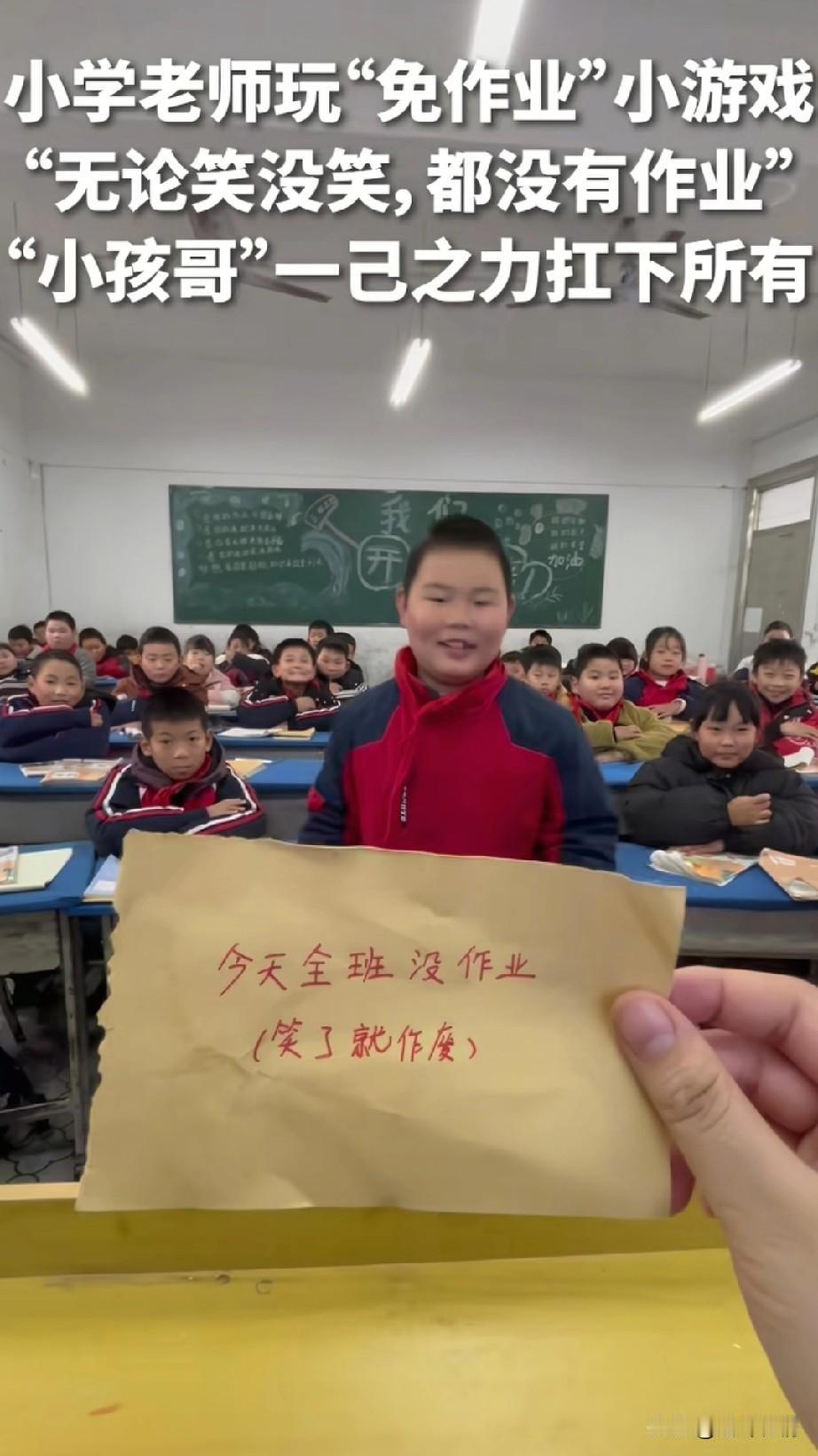 小学生玩免作业游戏的后续来了,小胖知道了同学那张纸条上的内容,看着他的老师笑了起来!整个班级都为免作业而开心! 近日一场小学生免作业的游戏火了,一名小学老师和她的学生玩起了免作业的游戏, 游戏开始后,她先让小胖上台领了一张纸条,告诉他不能让其他朋友小朋友看到!小胖也很信守诺言! 他将纸条藏起来之后就走了下去,随后另一名同学被老师叫了上来,一人也是给了一张纸条,只不过他们纸条上的内容是相反的! 小胖的纸条上写着,今天全班没作业,笑了就作废,第二个同学的纸条上写着,把他逗笑,全班没作业! 这真的是顶级阳谋,至此一场游戏开始,第二位同学站起身来走向了他的好友,开始给他挠痒痒, 不过小胖忍了下来,看一个学生不管用,老师就让其他学生上前帮忙,结果一堆小学生都围着小胖,使出了浑身解数,为了同一个目标而努力! 这还真是好玩,大家玩的不亦乐乎,直到最后小胖也没有被逗笑,这些同学都有点儿失望,因为自己没有完成这个任务, 不过结局让他们很兴奋,老师告诉他们小胖完成了任务,大家今天没有作业,这时候大家才明白过来,原来双方的目标是一致的,只不过是双方不知道而已! 这场游戏直接在网络上火了,许多媒体都纷纷转载,大家看的不亦乐乎,不同的人看到有不同的想法,你看到这个游戏会有什么看法呢? 小学生作业 小学生游戏