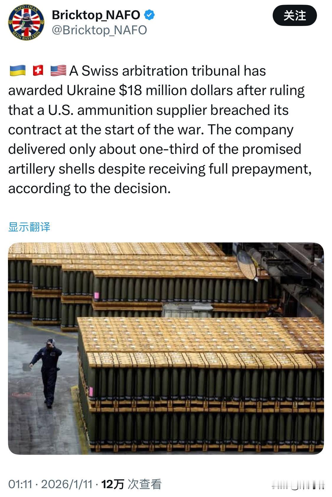 根据乌克兰司法部于 2026年1月9日 发布的消息,瑞士仲裁中心(Swiss Arbitration Centre)的仲裁法庭已裁定乌克兰国防部在一场针对美国弹药供应商的法律诉讼中获得全胜。 判决结果: 仲裁庭于2025年12月17日作出裁决,判定该美国公司违反合同,并责令其向乌克兰国家预算退还超过 1800万美元 的款项(含预付款及罚金)。 违约细节: 合同签署于俄罗斯全面入侵初期,涉及一批急需的炮弹。尽管乌方支付了 100%的预付款,但该公司交付的数量仅为承诺总量的 约三分之一,且存在严重的交付延迟及其他违约行为。 庭审情况: 该美国供应商曾辩称其已妥善履行合同,但仲裁庭驳回了被告的所有主张,认定其未能履行交付义务。 此次裁决被视为乌克兰在维护其国防采购利益及追究国际供应商责任方面的重大法律胜利。