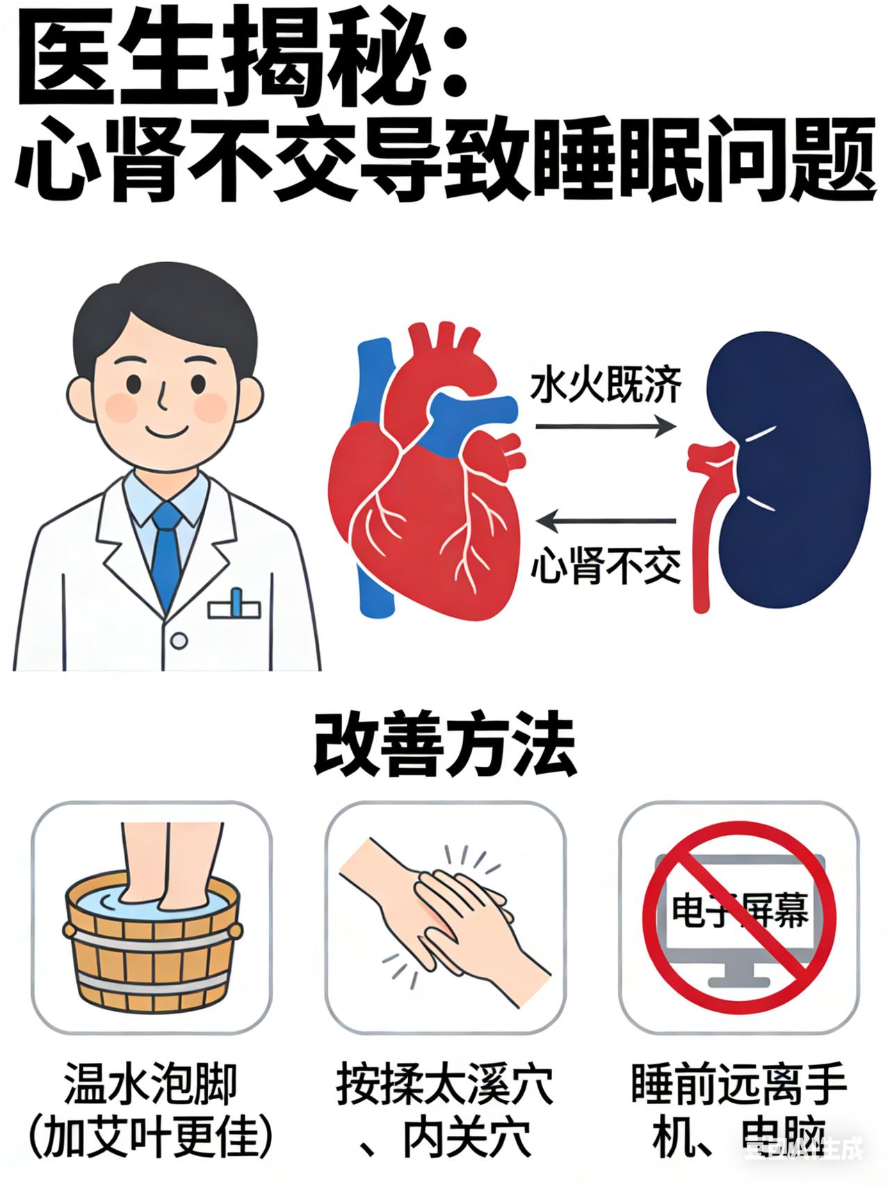 医生揭秘:入睡困难多梦易醒,可能是心肾不交!3 招改善睡眠质量 【睡眠自救手册:睡不着不是失眠,是身体“漏水”了!一杯茶+3个动作,找回婴儿般睡眠】 你有没有过这种崩溃时刻: 明明累得眼皮打架,躺下却像“煎鱼”一样翻来覆去;好不容易睡着,半夜一点动静就惊醒,整晚梦境连篇像在“跑马拉松”? 别只会吃褪黑素了!中医一针见血地指出:这不是简单的失眠,是“心肾不交”,你的身体“漏水”了! 🔍 简单粗暴的原理: 把身体想象成一个烧水的壶。心是火,肾是水。正常时,肾水上去浇灭心头的虚火,让你冷静入睡。 现在你熬夜太狠、想事太多,把锅底的水(肾阴)烧干了!火没了水的制约,就在上面乱窜,烧得你心烦、手心发热、腰膝酸软。 ✅ 教你一套“引火归元”实操法,今晚就试: 1. 喝一杯“交通茶”(灭火引路) 去药店抓黄连6克、肉桂3克(黄金2:1比例),开水冲泡代茶饮。 • 黄连是“灭火器”,专灭心头的烦躁火气; • 肉桂是“引路人”,把乱窜的火引回肾里取暖。(注:脾胃极寒者慎用,孕妇遵医嘱) 2. 睡前按摩“水火开关” • 按神门(手腕横纹骨头边):用力按揉3分钟,给心脏按下“静音键”; • 揉太溪(脚踝跟腱窝):这是肾经的源头,按着酸胀才有效,把“干渴”的肾水补上来。 3. 泡脚“引火下行” 水温40℃,加一小把吴茱萸粉或醋,泡到后背微微出汗。把聚集在头顶的热气拽到脚底,脚暖了,心就安了。 💡 医生最后叮嘱: 晚餐吃百合、莲子,别碰咖啡浓茶;睡前舌尖轻抵上腭(“搭鹊桥”),深呼吸意守丹田。 坚持7天,当水火重新“拥抱”,你就能一觉睡到大天亮!别硬扛,你的身体在求救,赶紧行动起来!