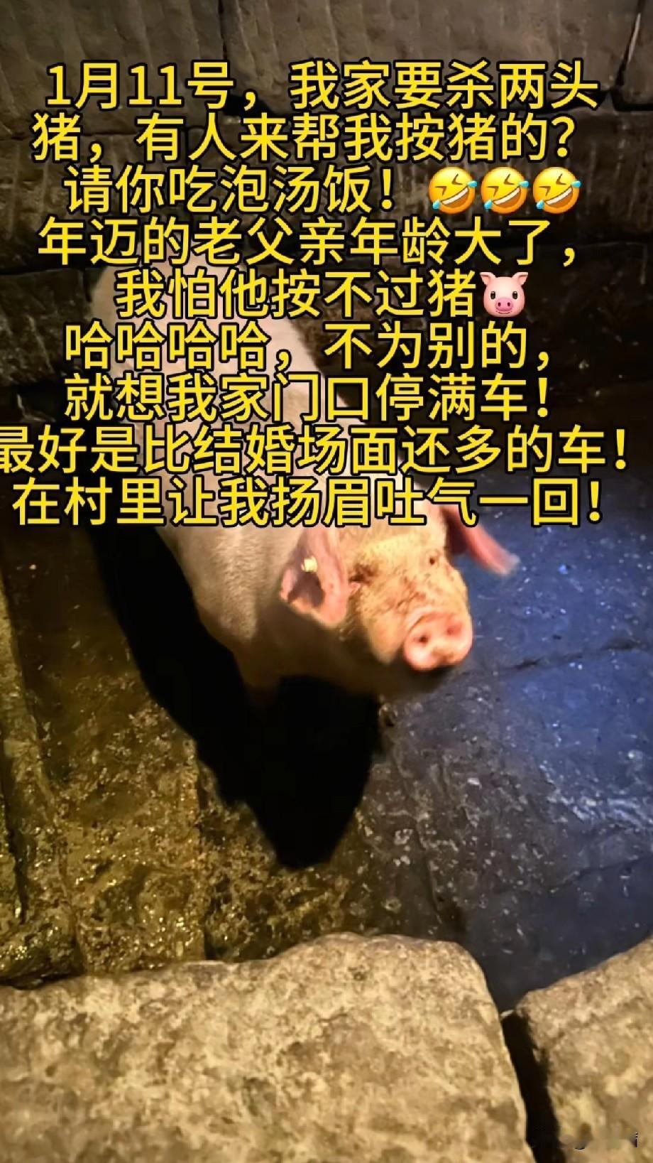 谁能想到,网上喊人帮忙杀两头猪,居然引来上千人驱车赴约!重庆合川的呆呆小姐姐,算是把“无心插柳”玩明白了。 1月9号凌晨,她发抖音求助,说11号家里要杀年猪,老父亲年纪大按不住,想找几个人搭把手,管一顿热乎刨猪汤,还盼着家门口停满车,在村里扬眉吐气一回。没成想,这条视频两天就攒了18万赞、14万转发,5个500人的“刨猪汤群”秒满,吓得她赶紧去派出所报备。 10号下午,距离杀猪还有一天,她家所在的庆福村就开始堵车,上百辆车从村口排到村委。11号当天更热闹,一千多网友带着礼物赶来,有帮忙按猪的、烧火的,还有网红“卤鹅哥”专程送卤鹅。原本计划杀2头猪,不够吃就加了3头捐助的,一共5头猪撑起了流水席。 合川文旅反应超快,不仅到场帮忙保障,还现场发钓鱼城门票。呆呆的直播间在线人数超10万,村里舞龙放烟花,比过年还热闹。派出所和村干部全程维持秩序,让这场意外的狂欢顺顺利利落幕。