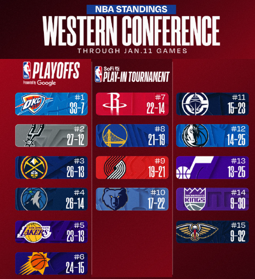 森林狼绝杀马刺,与湖人拉开至1胜场;湖人排名第5;太阳升至第6;火箭不敌国王跌至附加赛
