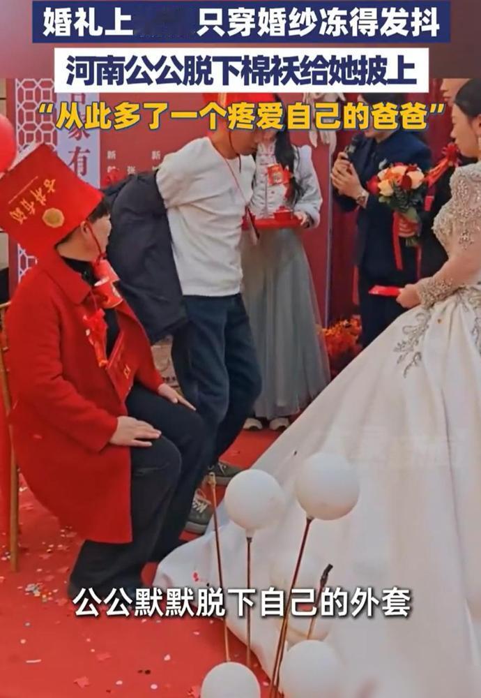 太暖了!河南周口,一对新人结婚,在改口环节中,新娘因为就穿了一件婚纱,冻得瑟瑟发抖,公公见状直接打断流程,把自己的棉袄脱下来给儿媳妇穿上,真的把儿媳当闺女了,网友:婚礼上最闪的配饰,不是钻石是棉袄。 当时新娘正要在院子里敬茶,河南这天儿确实冷,薄薄的婚纱哪挡得住风。司仪还在那儿按部就班地主持,新郎估计也紧张得没顾上,反倒是坐在主位上的公公第一个看出了儿媳妇在打冷颤。 我更在意的是那个瞬间,老人家完全没顾什么“流程顺不顺”,直接起身就把自己厚实的棉袄披了过去。 现在的婚礼往往被办成了大型秀场,大家都在盯着照片好不好看、仪式高不高级,反而容易把活生生的人给忽略了。 其实没必要去抠什么“公公脱还是婆婆脱”的细节,这种下意识的保护欲才是最真实的,根本来不及在脑子里转几个弯。 这种不在设计里的举动,往往比那些排练好的煽情台词更能打动人,因为它没想过要演给谁看。 新娘刚进门,身份正尴尬呢,这种时候被公婆当成自家孩子心疼,心里的安全感一下子就拉满了。 说白了,改口费给多少那是面子,这种关键时刻能有人替你挡挡寒风,才是往后日子里的里子。 这种被全家人时刻看在眼里的感觉,大概就是嫁对人最直接的证据吧。