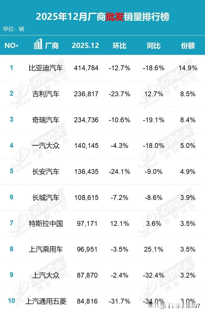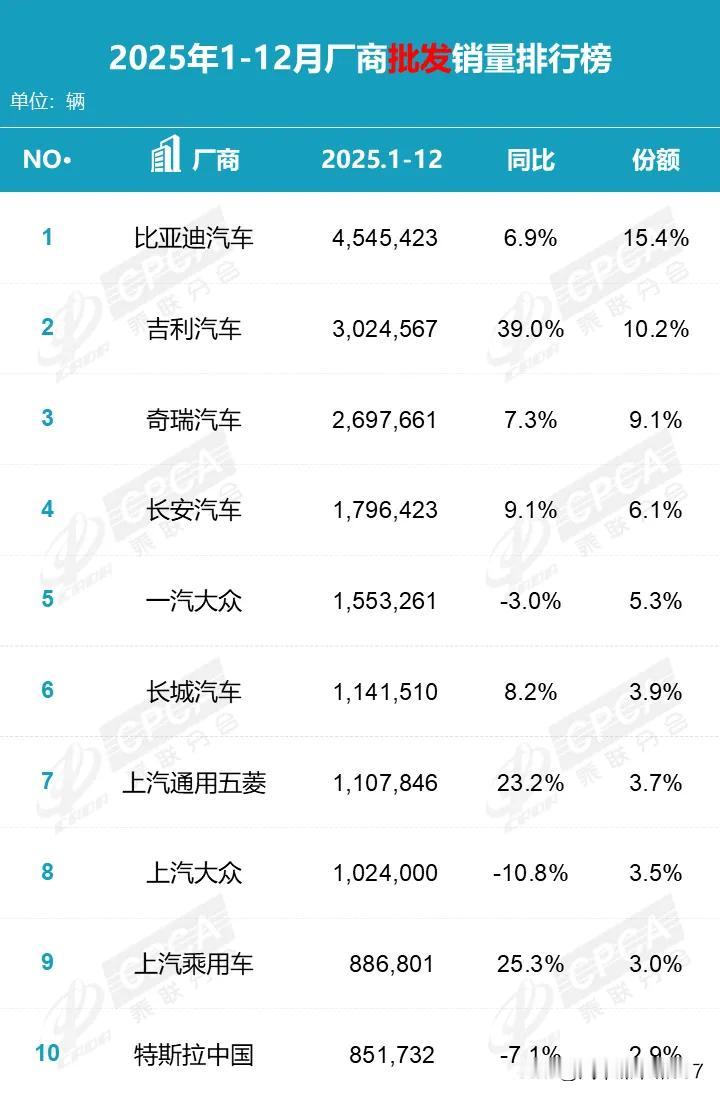 乘联会公布12月及全年累计销量排行榜,比亚迪一马当先,可谓实至名归! 吉利增速最为显著,有摸着比亚迪“过河”之态,明年能否追上这一标杆呢? 奇瑞发展稳扎稳打,不过7.3%的增长率只能算勉强及格。今年市场变化剧烈,上半年奇瑞有些力不从心,虽推出几款新能源车型,但收效甚微,直至风云A9L才打造出首个爆款。年底又陆续推出星途et5和风云T11,这才勉强跟上进度。 明年奇瑞将有icar v27、v25,风云A9、T9L、捷途旅行者7、自由者7、环游者,纵横F700、星途EX6、EX7、ES7等十多款新能源车型推出,想必会迎来爆发式增长! 长安今年稳中有进,尤其是在新能源板块,深蓝取得了不小的市场份额。