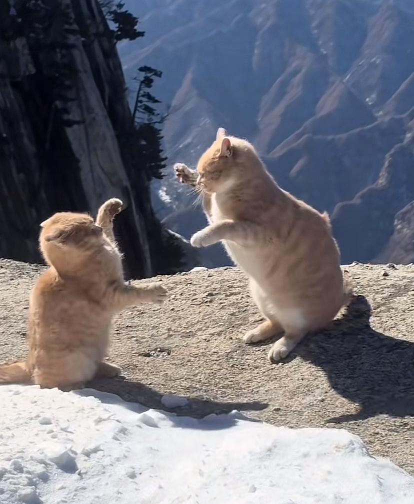 最近网上一段视频火了,画面里两只小猫在华山西峰顶上“对打”,爪子一伸一缩,尾巴还