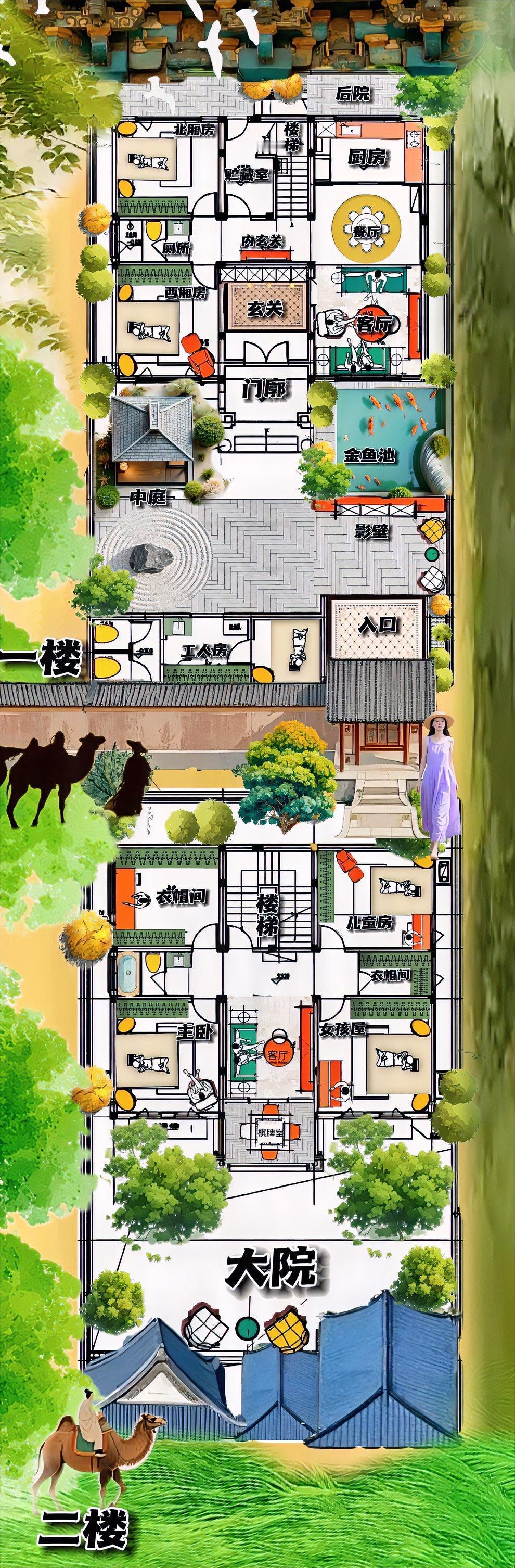 这合院太心机了,其中厉害的自建房,572㎡打明牌,说实话,能把二进式,整出一个真诚无界的格局! 合院布局没想象力,平凡六居室! 一进院,讲究意境,二进院,平凡见生活,真通菜园子! 最高兴还是门房,阳光明媚差三分,隐私权加三分,反正就是一排逍遥自在的生活套房! 与客厅一个待遇,享受104㎡大花园风韵的精彩! 最特殊地方,两个玄关,外玄关管面子,内玄关是景观,相当于一亩地大宅子,没闲散空间! 重点它俩个关系,不打架! 一条小洄游动线,用端景给自建房的体面! 咱家院子,意境,可不一般,左鱼池,右亭子,小小前院,有苏式园林的气质! 最高兴的二楼三居室,还整个二客厅,忽然比大平层年轻,活脱脱的乡村大合院!