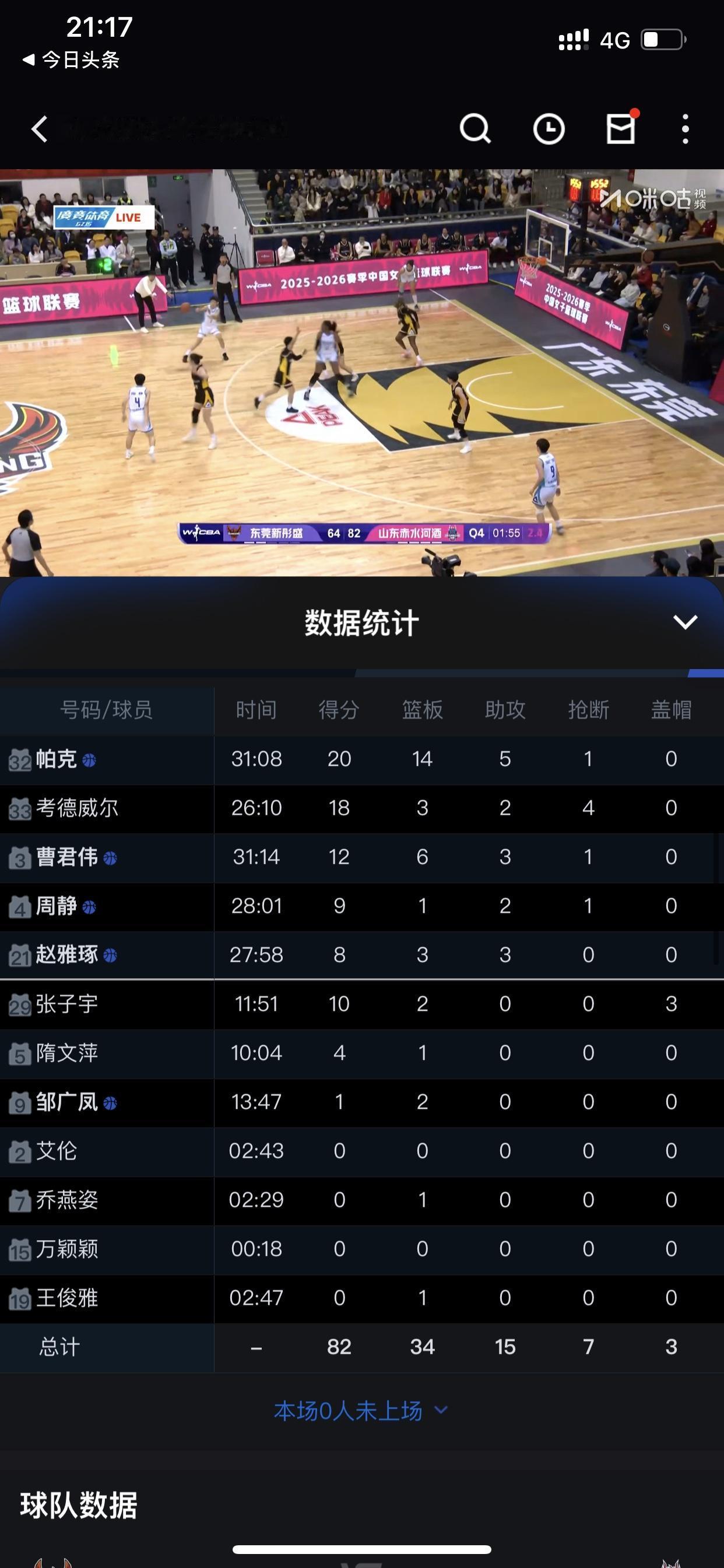 东莞女篮不败战绩被山东女篮打破! 这场比赛虽然还有1分钟才会结束,但是山东女篮已经领先20分,所以已经没有任何悬念了 本场比赛,张子宇都出场打了11分钟,斩获10分2板,66%的命中率,张子宇只要多多打比赛是会越来越好的 我没有看这场比赛,只是因为在看江苏女篮与武汉女篮的比赛时,关注这场比分,发现山东女篮领先20分,所以忍不住进去看了 恭喜山东女篮强势击败WCBA本赛季暂时的第一名,并且击破她的不败金身 加油,山东女篮n