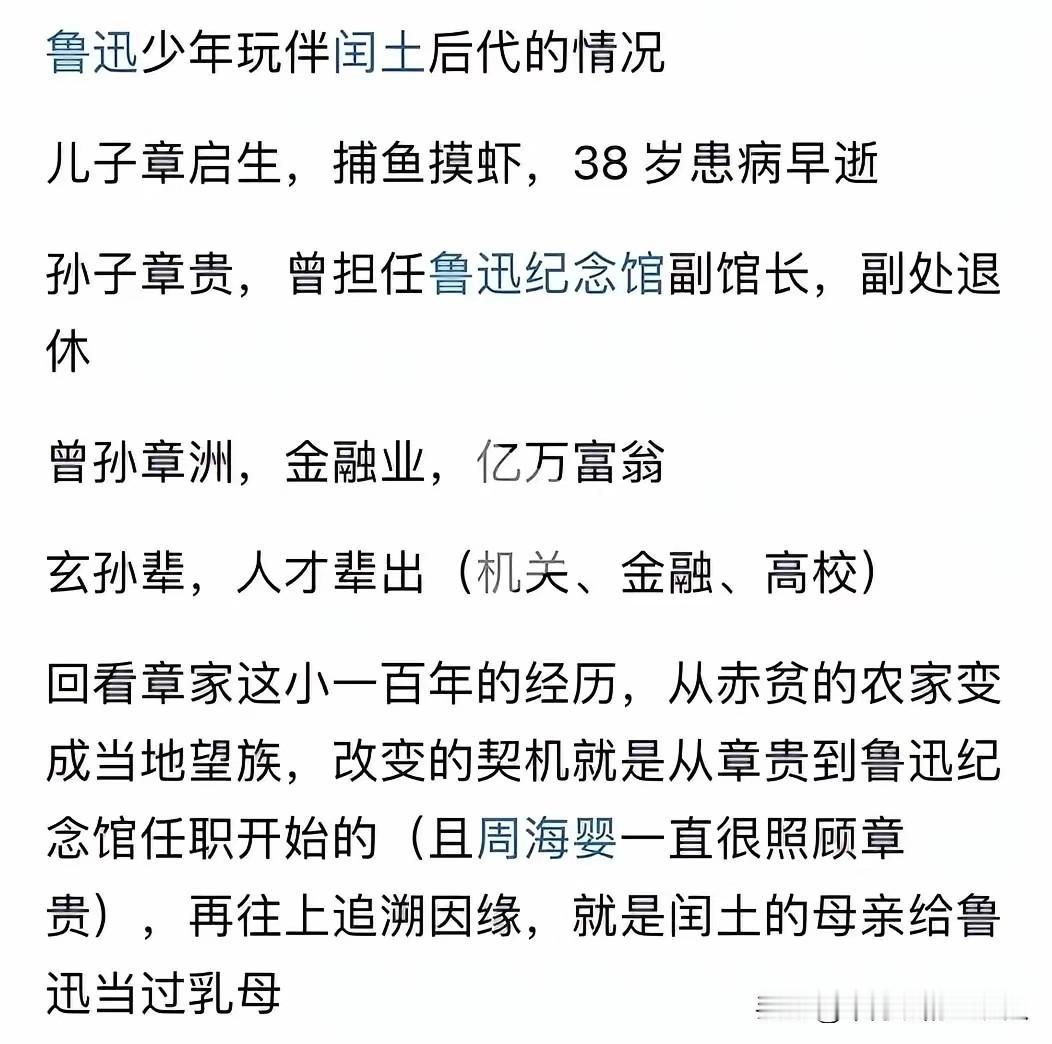 闰土后代的阶级跃升:一层因缘,百倍捷径 闰土的故事,是刻在教科书里的刺——那个项带银圈、手捏钢叉的少年,最终被生活磨成了“灰黄的脸,皱纹间时常夹些伤痕”的老农。谁能想到,百年之后,他的子孙竟完成了从赤贫农家到当地望族的阶级跨越。 儿子章启生承袭了闰土的生计,捕鱼摸虾,困在一方水土里,38岁便因病早逝,是乡土中国里最常见的生命轨迹。 真正的转折点,攥在闰土孙子章贵手里。任职鲁迅纪念馆副馆长,副处级退休——这份体制内的体面,绝非仅凭农家子弟的勤恳就能换来。周海婴(鲁迅之子)的照拂是明晃晃的助力,而这层助力的源头,不过是百年前闰土母亲给鲁迅当过乳母的一段因缘。 对无数普通人而言,一个副处级的位置,是寒窗苦读十数载、职场拼杀一辈子都未必能摸到的天花板。多少人挤破头往体制里钻,熬白了头也只是个底层办事员;多少人勤勤恳恳任劳任怨,到头来连编制的门槛都摸不着。可章贵凭着这层百年前的因缘,直接站上了普通人望尘莫及的台阶。这个副处级头衔,不只是一份工作,更是一张资源通行证,一个能托举起下一代的平台。 从此,一切水到渠成。曾孙章洲踩着前辈铺好的路,跻身金融业,成了亿万富翁;玄孙辈更是遍布机关、金融、高校,人才辈出。他们不用再像祖辈那样,靠天吃饭、靠力气谋生,因为祖辈的一段际遇,早已为他们铺好了康庄大道。 这百年变迁,像一面镜子,照见了阶层跃升的残酷真相:没有鲁迅这层关系,章贵大概率会重复父辈的命运,守着薄田或渔网度日;没有体制内副处级的履历加持,章洲也难有叩开金融大门的敲门砖。所谓的“天道酬勤”,在现实的壁垒面前,往往不堪一击。 一份跨越百年的乳母情谊,成了章家阶级跃升的天梯。这不是励志故事,而是赤裸裸的现实——有些人生的起跑线,早在祖辈的一次相遇里,就已经划定。普通人的奋力奔跑,或许只是别人的起点。