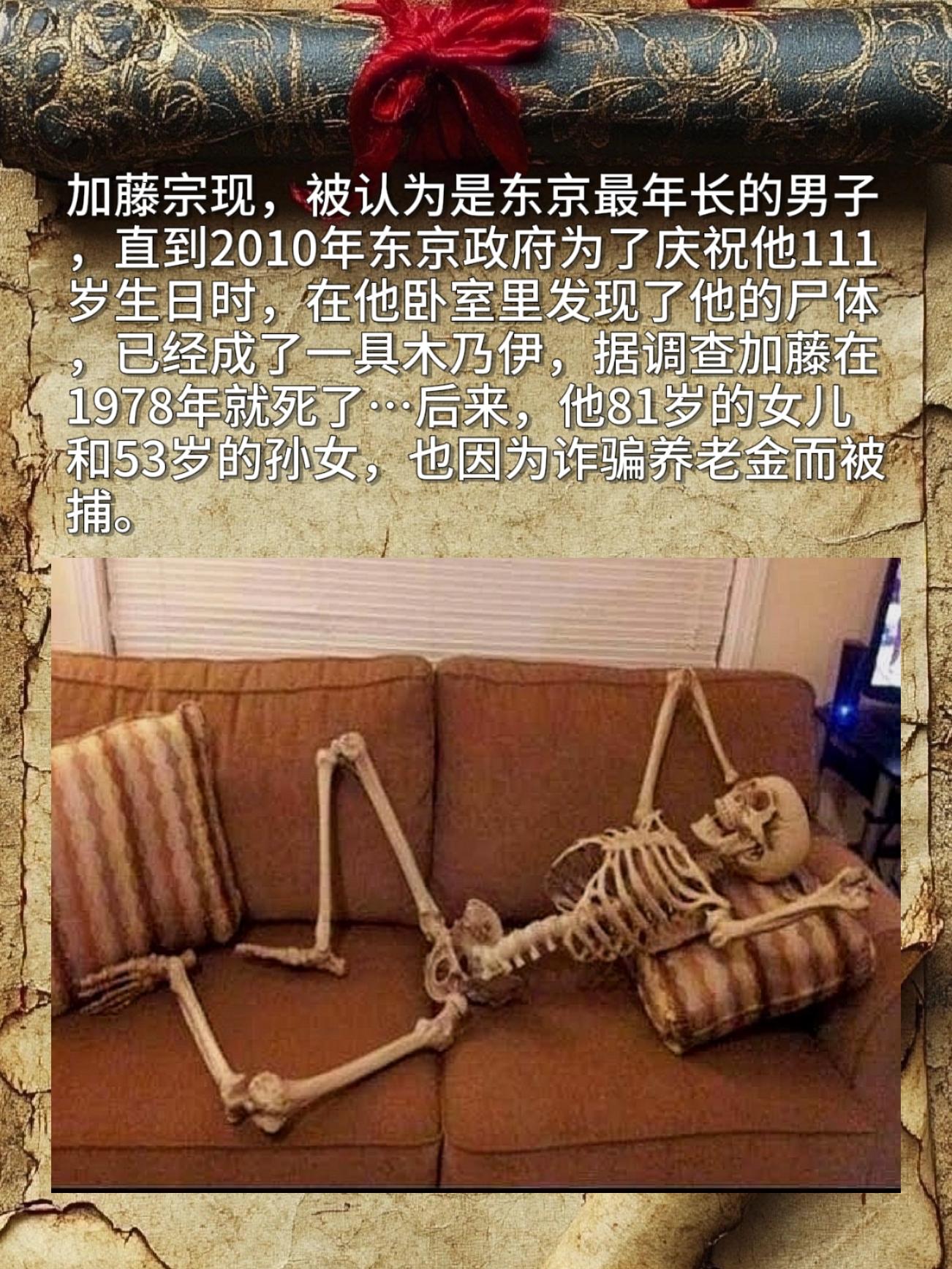 加藤宗现,被认为是东京最年长的男子,直到2010年东京政府为了庆祝他111岁生日时,在他卧室里发现了他的尸体,已经成了一具木乃伊科普一下