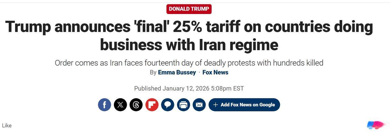 特朗普宣布美国对所有和伊朗有贸易往来的国家加征25%关税 在Truth Social分享的一篇帖子中,特朗普表示,任何继续与伊朗伊斯兰共和国做生意的国家都将面临与美国的所有贸易的25%关税 特朗普写道:“立即生效,任何与伊朗伊斯兰共和国做生意的国家都将面临与美利坚合众国做生意的任何和所有业务支付25%的关税。此命令是最终的和决定性的。感谢您对此事的关注!”