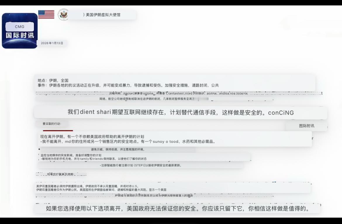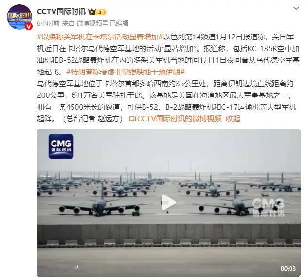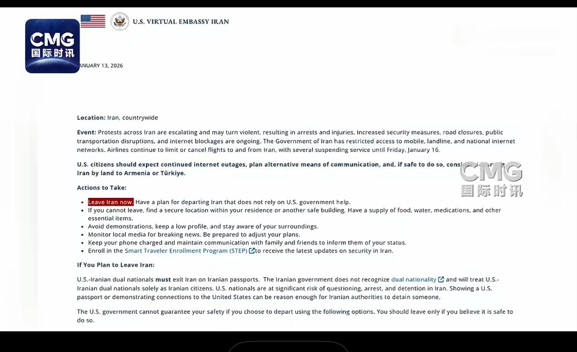 对伊动武信号强烈!美国公民被要求立即离开伊朗。 据美国媒体报道,美国国务院当地时间1月12日发布紧急安全警示,要求美国公民“立即离开伊朗,制定不依赖美国政府协助的离境计划;如无法离境,留在住所或其他安全建筑内,并储备食物、水、药品及其他生活必需品;避免参加任何示威活动,保持低调,注意周围环境;关注当地媒体获取最新消息,并随时调整计划;保持手机电量充足,与家人朋友保持联系,及时告知情况”。 可见,一场新的战争,已是一触即发。种种迹象表明,美以将很快就会对伊朗发动攻击。事实上,1月11日,美国对伊朗的所有作战方案,“已经摆放到特朗普面前”。1月13日,特朗普还将召集国务卿鲁比奥、国防部长赫格塞思等人开会,商讨最后决策。 别忘了,在袭击委内瑞拉得手后,大受鼓舞的特朗普,确实有发动闪电袭击的冲动。他明确表示,自己不需要国际法,唯一能阻止他的,“是我自己的道德观念”! 据以色列第14频道1月12日报道称,美国军机近日在卡塔尔乌代德空军基地的活动“显著增加”。乌代德空军基地距离伊朗边境直线距离约200公里,约1万名美军驻扎于此。该基地是美国在海湾地区最大军事基地之一,拥有一条4500米长的跑道,可供B-52、B-2战略轰炸机和C-17运输机等大型军机起降。