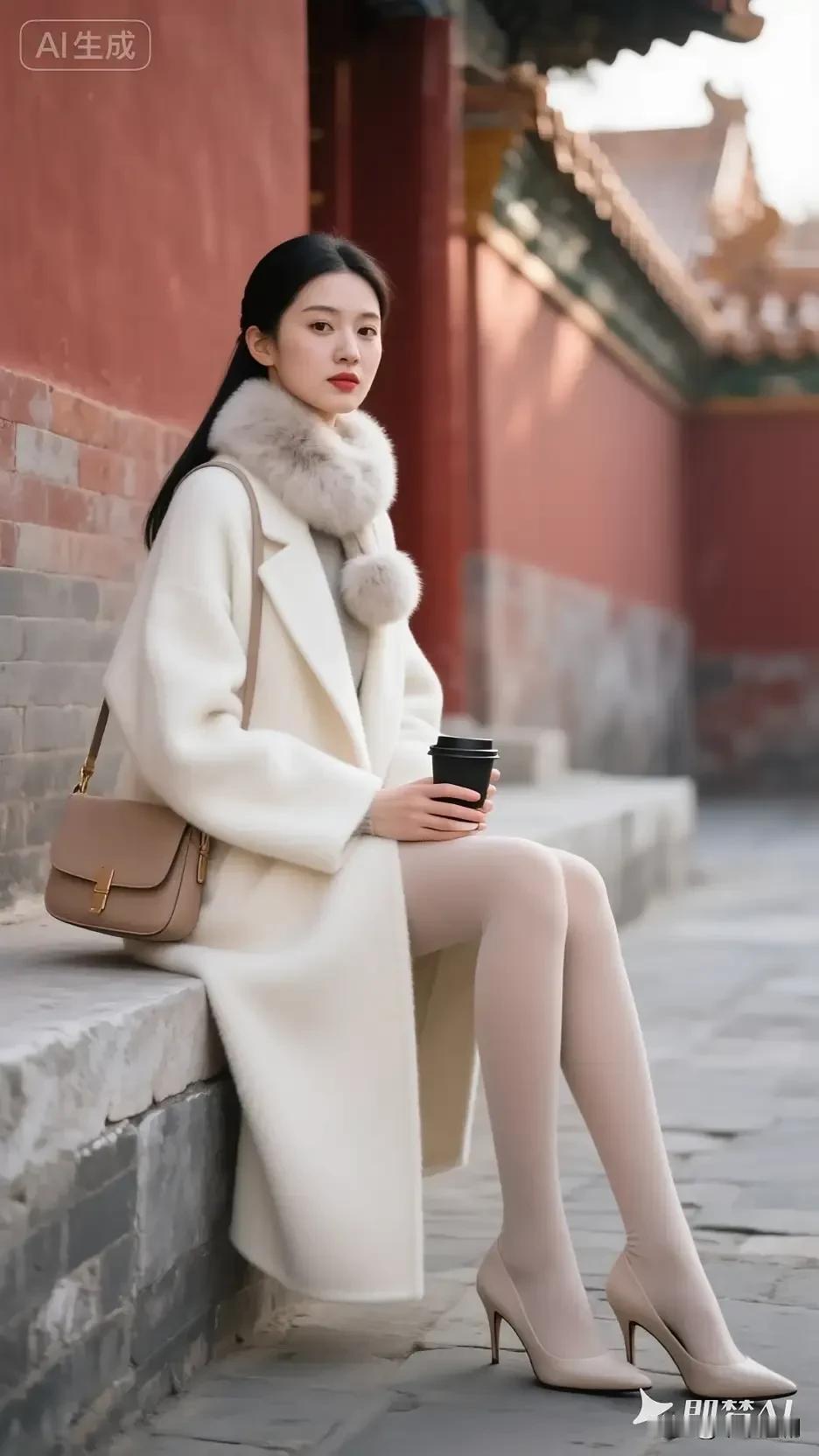 米白毛呢大衣搭毛绒围脖,宫墙红墙背景揉出贵气又温婉的冬日氛围感☁️ 灰色羊绒呢大衣 温柔系大衣搭配