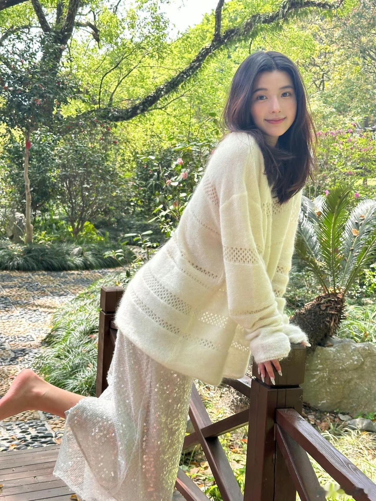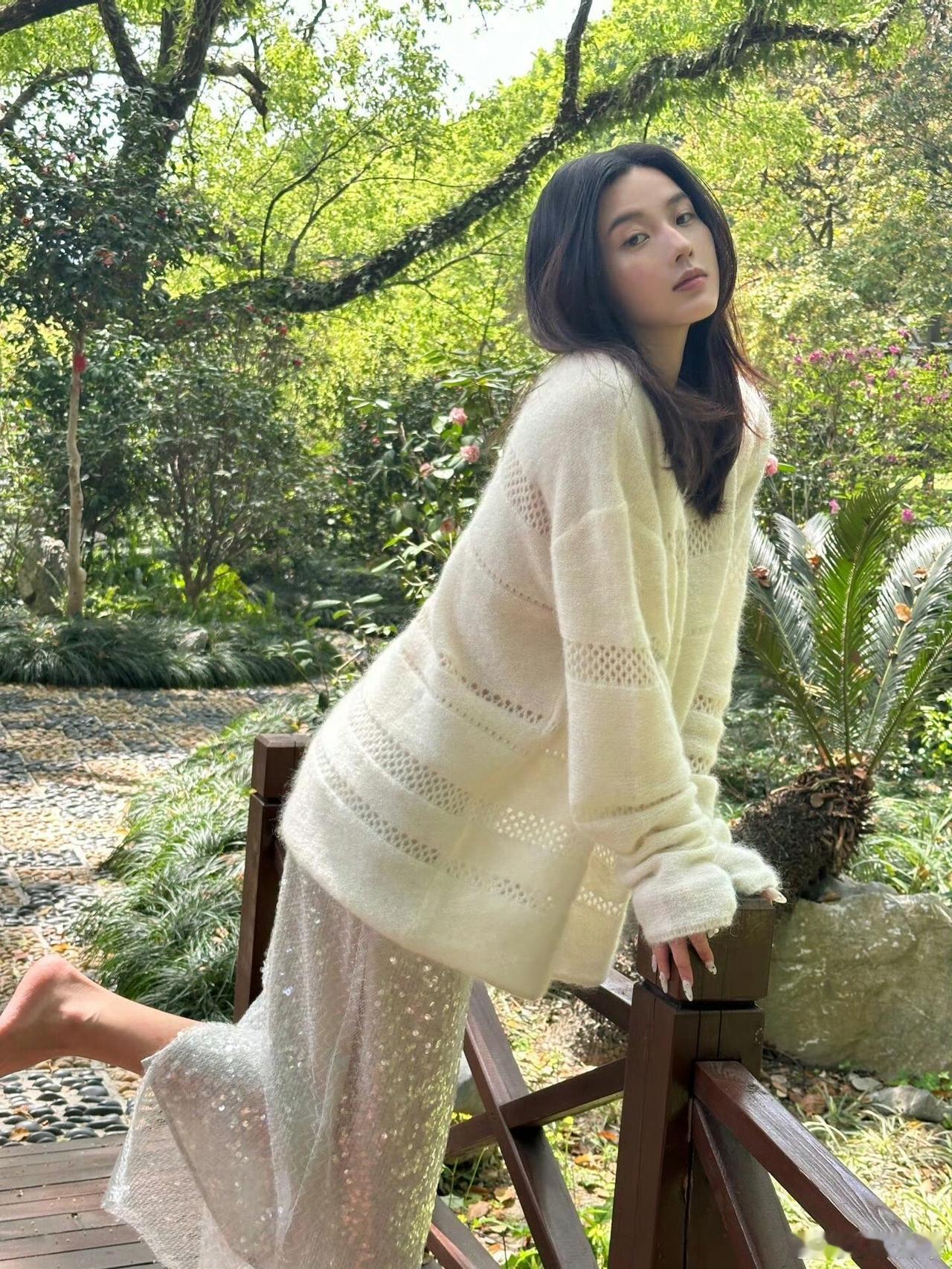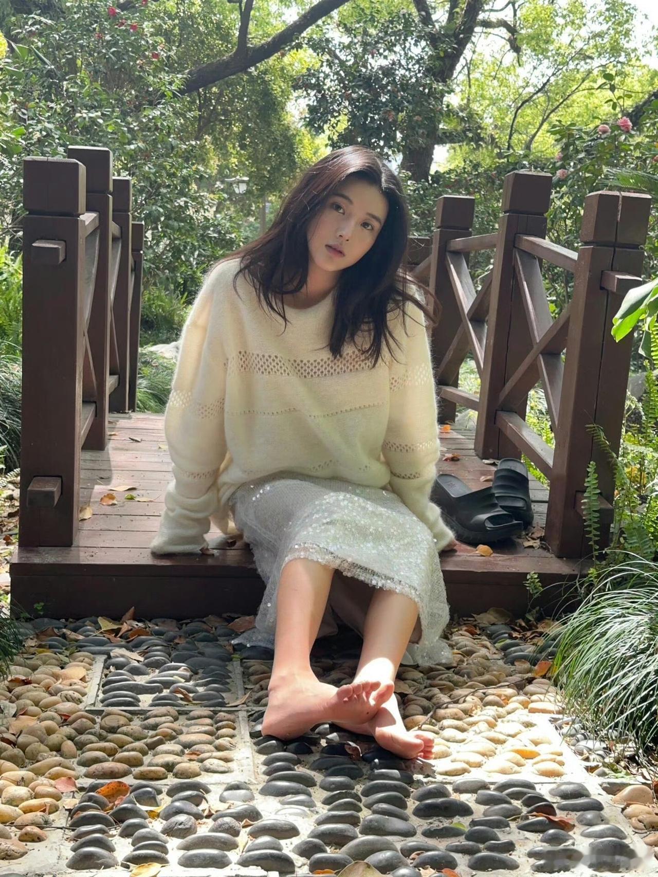 把慵懒写进穿搭里,软糯的白毛衣配blingbling的亮片裙,赤脚踩在鹅卵石路上