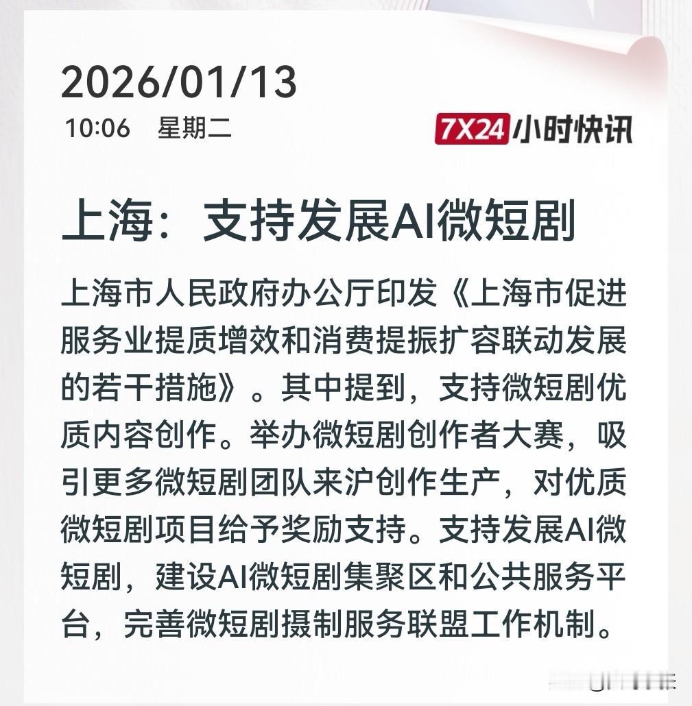 上海力挺AI微短剧,概念股乘风启航!2026年1月13日,上海市人民政府办公厅印发相关政策,明确提出支持发展AI微短剧,建设集聚区与公共服务平台。这一消息出台是否利好 “Ai+ 微短剧”的概念,因为 Ai 是当下热门风口,可能一时半会没有炒到,但是后面肯定会起来的!收藏备用吧!