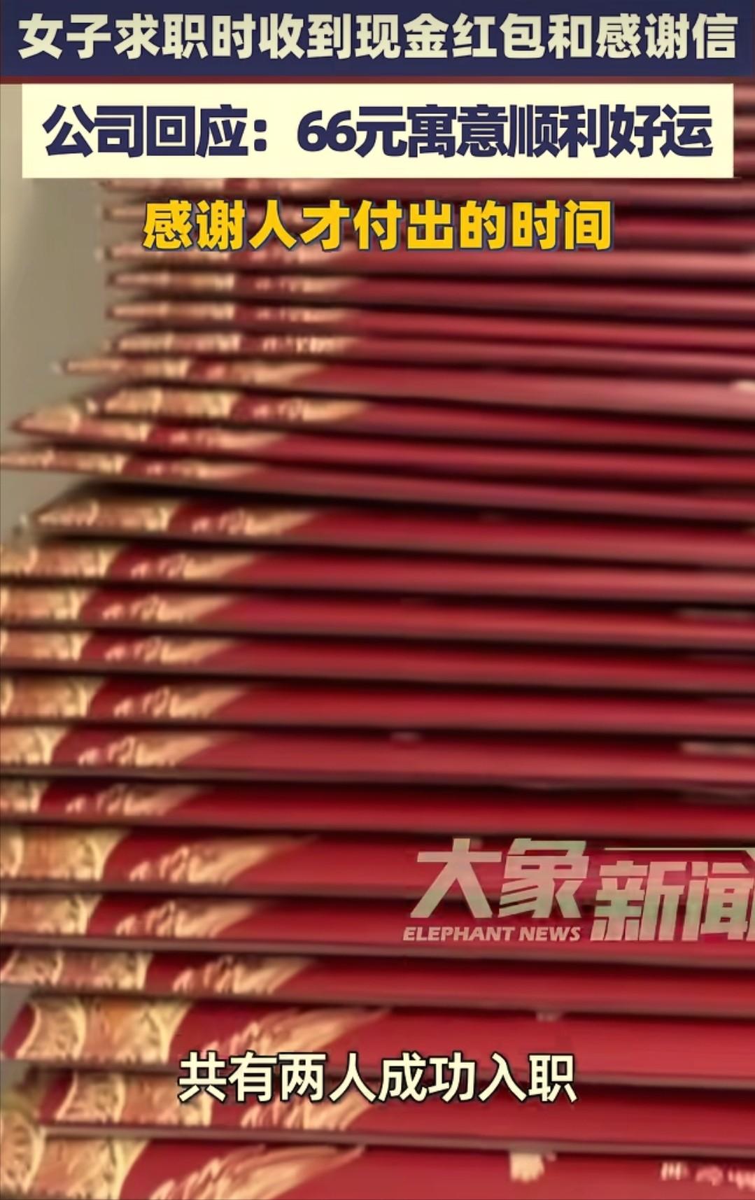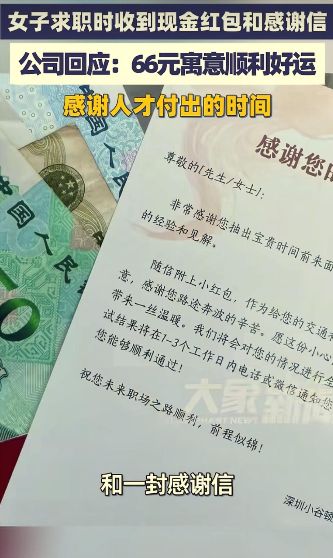 万万没想到!深圳,一女子面试工作,正准备离开时,人事却突然叫住了她,女子以为面试又要出问题,没成想人事竟然递给她一个66元的红包和一封感谢信,还说:“这是公司对人才的尊重。”女子瞬间被感动了,紧张的情绪一下子就清空了。网友:这是什么神 仙公司啊! 事情就发生在深圳的一栋写字楼里,这位女子已经在求职市场上奔波了快一个月,投出去的简历要么石沉大海,要么面试后就没了下文,这次的面试机会她格外珍惜。 面试当天,她提前半小时就到了公司楼下,反复梳理自己的简历和求职话术,直到确认无误才走进写字楼。 整个面试过程还算顺利,面试官提问专业又温和,女子也尽力展现了自己的能力,但结束后心里还是没底。 走出面试间时,她能明显感觉到自己的手心还在冒汗,毕竟在竞争激烈的深圳,一份合适的工作实在太难找。她收拾好自己的东西,轻轻带上房门,正准备走进电梯离开,身后突然传来了人事的声音。 “请等一下!”听到喊声的瞬间,女子心里咯噔一下,脚步猛地顿住。她下意识地攥紧了手里的包,脑子里飞速运转,反复回想面试时有没有说错话、做错事, 是不是自己的回答让面试官不满意,甚至开始担心对方会当场告知自己不符合要求。带着满肚子的忐忑,她转过身看向追上来的人事。 让她万万没想到的是,人事脸上带着温和的笑容,手里还拿着一个红色的信封,快步走到她面前递了过来。 女子愣在原地,迟疑着接过信封,人事轻声解释,这是公司给每一位前来面试的求职者准备的,里面有66元现金和一封感谢信,还补充了一句“这是公司对人才的尊重”。 女子捏着薄薄的信封,瞬间没了之前的紧张。她当场拆开信封,里面除了一张写着暖心祝福的感谢信,还有一沓叠得整整齐齐的66元现金。 感谢信里字里行间都透露着对求职者的尊重,感谢她愿意抽出时间前来面试,无论最终是否录用,都祝愿她能顺利找到心仪的工作。 看着信上的文字,再握着手里的红包,女子的眼眶瞬间有点发热。这段时间求职路上的委屈和焦虑,好像都在这一刻被抚平了。 她原本以为,面试只是企业筛选求职者的过程,却没料到这家公司会如此在意求职者的感受,连这样的细节都考虑得如此周全。 后来她才知道,66元在广东地区有着吉祥顺利的寓意,公司之所以准备这个红包,就是希望每一位前来面试的求职者都能顺顺利利。 而且这项举措并不是临时起意,而是公司早就确定的制度,无论面试结果如何,只要是专门赶来面试的求职者,都会收到这份小小的心意。 女子把自己的经历和红包、感谢信一起拍成视频分享到了网上,很快就吸引了大量网友的关注。视频里,她拿着红包的手还有点微微颤抖,能明显看出内心的激动。 网友们看完纷纷留言,有人说“这才是神仙公司该有的样子,细节见人品”,还有人分享自己的求职经历,吐槽那些面试时态度傲慢的企业,对比之下更觉得这份温暖难能可贵。 不少正在求职的网友表示,这样的企业哪怕最终没录用自己,也会让人觉得很舒服,甚至会主动推荐给身边的朋友。 还有网友说,66元钱不多,但这份尊重和心意是花钱买不来的,现在职场竞争激烈,企业之间拼的不只是薪资福利,这种藏在细节里的温度,才是真正能留住人的关键。 女子坦言,这份突如其来的温暖,让她重新找回了求职的信心。原本因为多次碰壁产生的自我怀疑,在收到红包的那一刻烟消云散。她已经把这家公司记在了心里,无论最终是否能入职,这段温暖的面试经历都会成为她求职路上的一道光。 对此,你们有什么看法,欢迎评论留言~