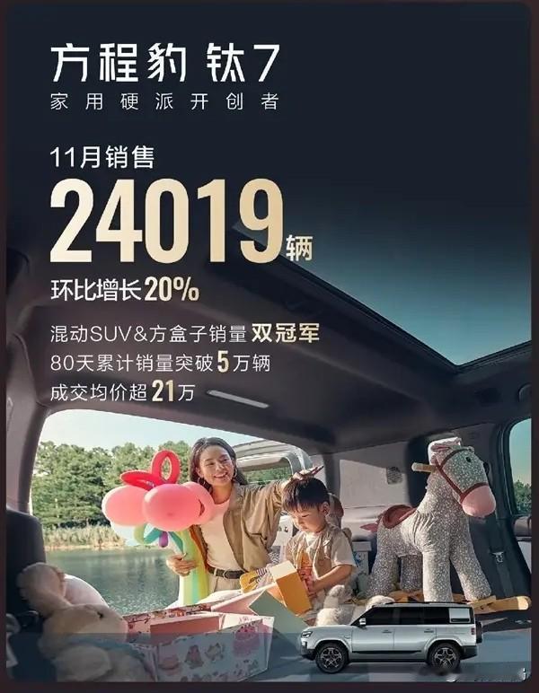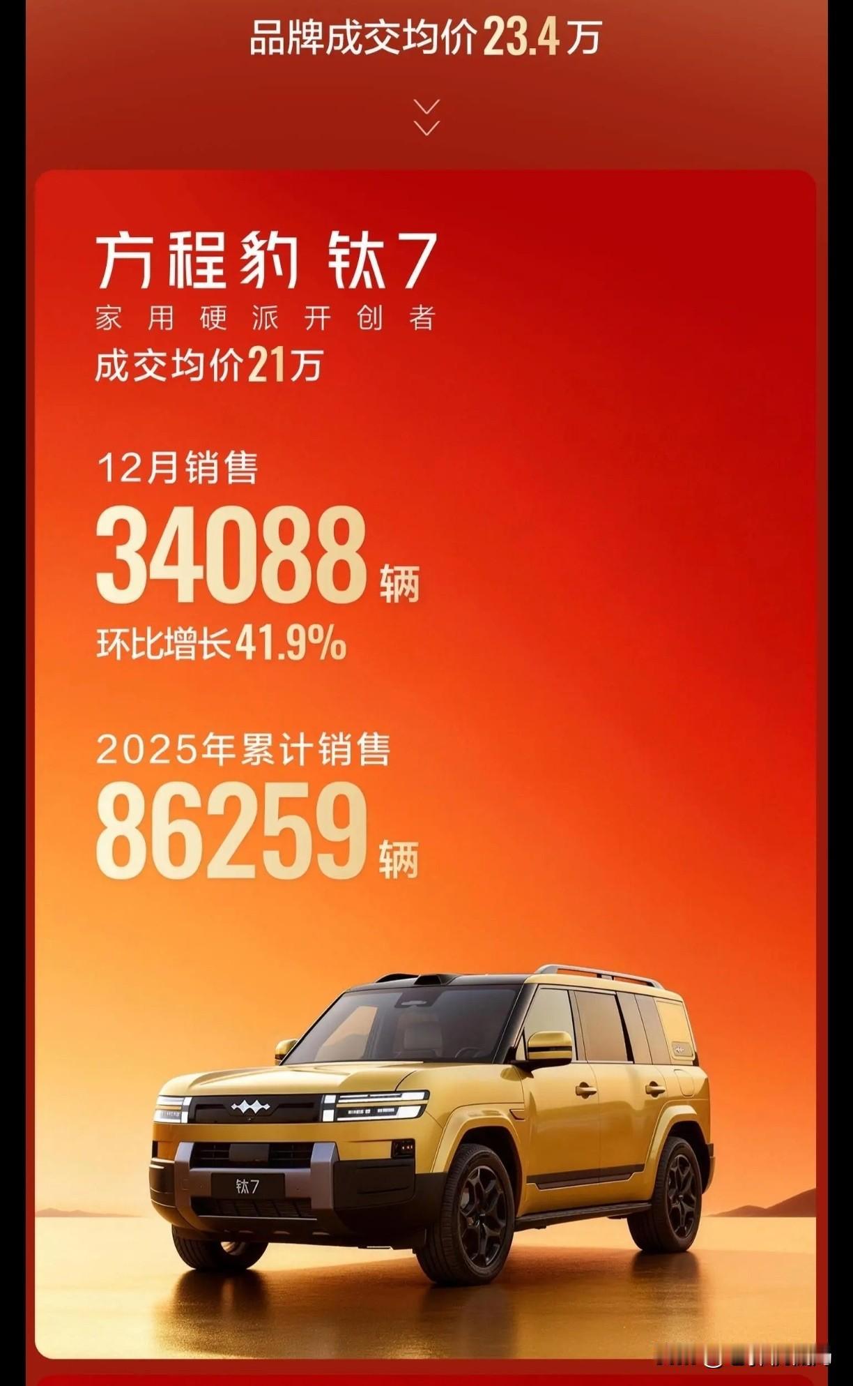 但凡在中国开车的基本都会相信这句话,有人说比亚迪之所以卖得好全靠价格低。 2025年底的新势力销量榜,居然杀出这么一匹黑马! 方程豹这牌子,原本只是比亚迪旗下的个性化品牌,结果靠着钛7直接杀疯了——10月卖2万+,11月冲2.4万+,12月狂卖3.4万+,三个月销量一路狂飙! 更狠的是,这台车均价超20万,而且90%的车主都直接冲高配!要知道顶配才21.98万,却能拿到激光雷达、四驱4.5秒破百、1300公里综合续航这些硬核配置。 就靠钛7的爆发,方程豹12月销量破5万,一举冲到新势力第三,仅次于鸿蒙智行和零跑,把咱们熟悉的蔚小理都甩在了身后! 这哪是什么小众个性牌,分明是比亚迪下的一盘大棋——当其他新势力还在纠结性价比和高端化时,方程豹已经用一款车撕开了市场的大口子!汽车人共创计划 文 张国成