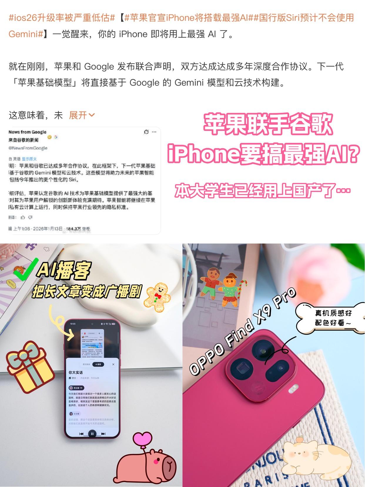 iPhone要搞最强AI?我先退一步了… 每次看到苹果热搜都咯噔一下🤯 听说又要整zui强AI? 😓听着是挺厉害的,但按惯例八成又是海外专属吧? 国行版估计又要等明年画饼了… 作为不吃饼的大学生,元旦我就从iPhone跳车了! 毕竟国产机在AI这块早就不玩虚的 精心挑选了一番,换了📱OPPO Find X9 Pro 目前用下来我还挺满意的👇 AI功能还挺多的 比如我常用的💡AI写作 写周报直接让AI生成大纲 不到1分钟搞定废话文学👍 出去旅游也可以用它做攻略,实用的嘞~ 还有这个AI播客 💡坐地铁的时候直接把文章丢给AI播客 秒变耳机里的真人朗读,让眼睛休息休息~ 🎉不过作为爱拍爱发圈星人,我蕞爱的还得是「出圈实况拼图」 直接把好几张live图拼起来,然后一键出圈 人像、宠物都可以“砰”出相框,贼有意思 发圈之后被好多闺蜜狂问P图教程😊 🤔真心建议别苦等苹果画饼了! 国产AI早就在天上飞了✈️ ‼️重点来了 现在OPPO还有国补三重礼+200限时特hui券 加起来至高➖700,还有限定礼盒+24期免xi 冲旗舰机还省几顿火锅钱,确实香麻了…🤤 新手机国产手机苹果OPPO Find X9 Pro