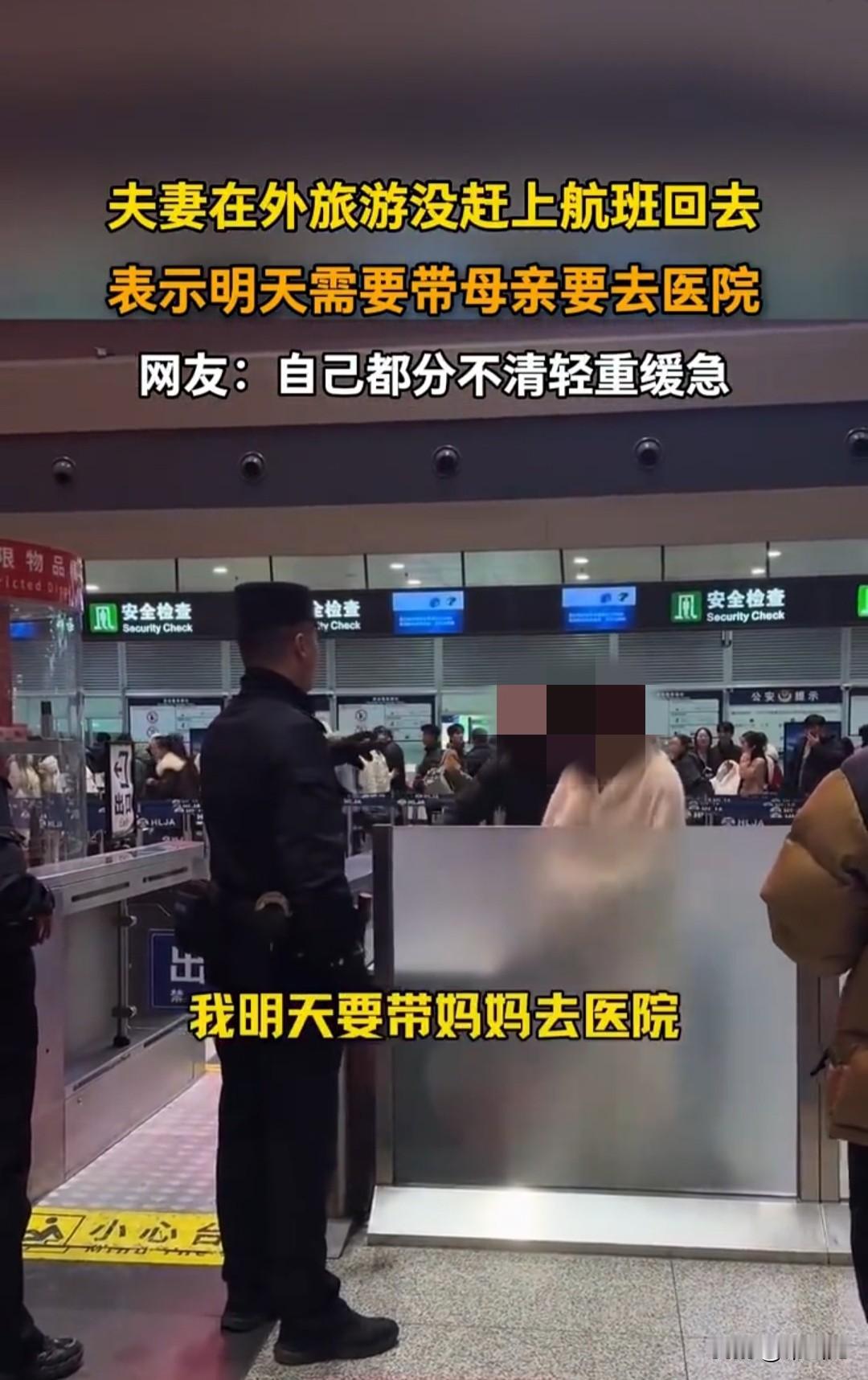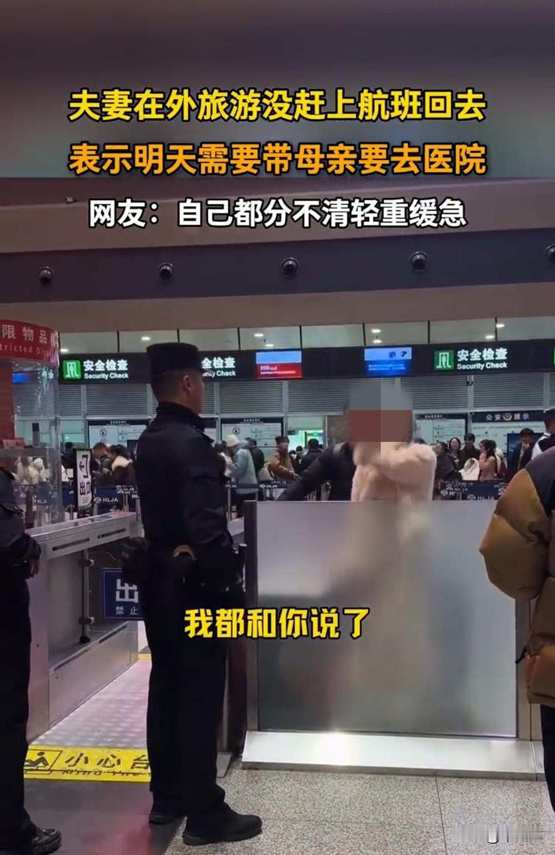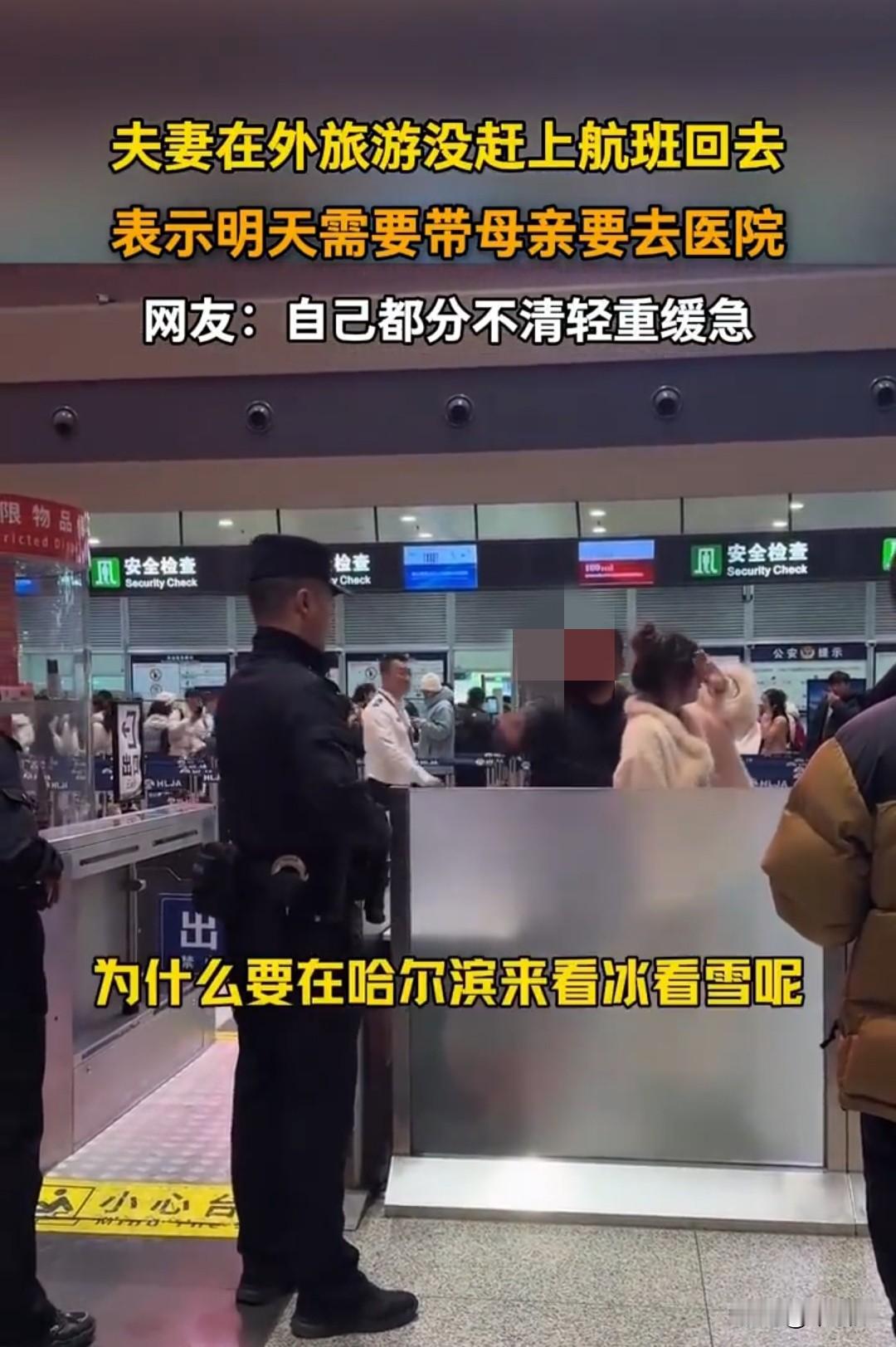 夫妻俩没有赶上航班,赶到机场时安检通道已关闭,两人情绪失控,对着安检人员大吵大闹。 丈夫懊恼地说:“我们烟台也有冰也有雪,为什么要大老远跑来哈尔滨看冰看雪呢?” 妻子捶胸顿足地对着安检大吼:“都和你说了,我明天要带妈妈去医院。” 妻子的意思,我虽然迟到了,但我有特殊情况,我明天要带妈妈去看病,如果今天不能坐上飞机,那妈妈的病情就会被耽误了。 这么重要的事情跟你反复讲了,你还听不懂吗? 明里暗里就是在说,我虽然是耍赖,但你们就是要让着我。 老人一旦出现意外,你们机场要承担全部责任。 怎么会有这么糊涂的人,明明是自己的错误,却要别人来承担。 为什么赶不上航班,是因为路上遇到突发事件,时间没有规划好,还是因为天气和航空管制,造成航班延误。 如果是后者,因为不可抗力原因造成航班取消或改签,机场会给出明确理由的。 但看情形应该不是,如果是那样的话,他们只会吵得更凶,会更加理直气壮。 由此看来,是因为个人原因造成的,那你冲工作人员吼什么,人家也是按规定办事,放你过去就违反规定了。 要带妈妈去医院,为什么不提前规划好时间,早点赶来。 或者说为什么要在带妈妈去医院的前几天出门旅游,不能先陪妈妈去完医院再出门,非得卡这个点吗? 还是去医院的时间早就约好了,既然如此,那就更不能出来旅游了,去医院错过一次很麻烦,旅游这次错过了,下次还可以。 孰轻孰重,这点都分不清吗? 有事说事,烟台有冰也有雪,跟你没有安排好时间,错过航班有什么关系,哈尔滨可不背这个锅。 网络素材,如果存在侵权,请联系删除