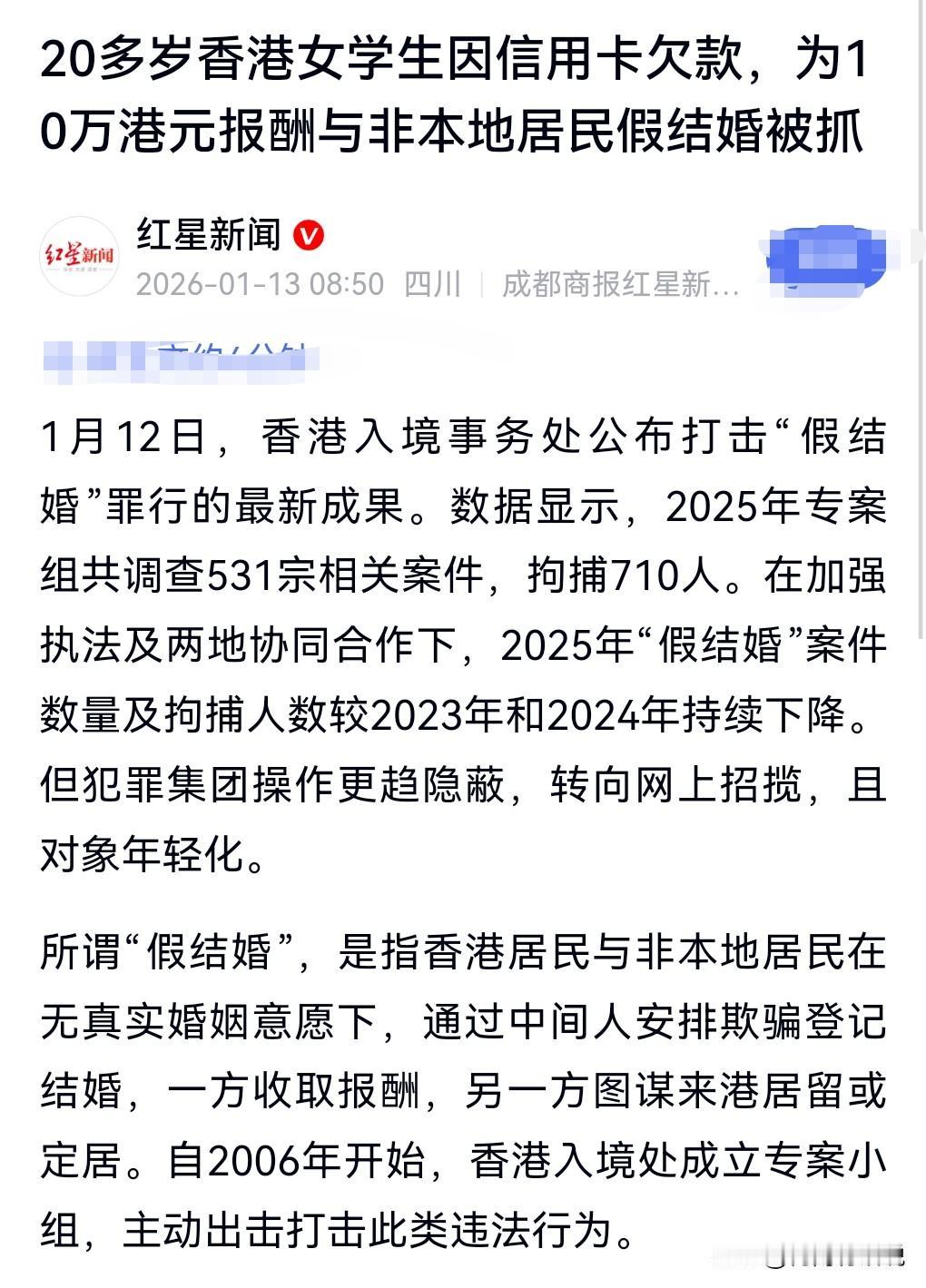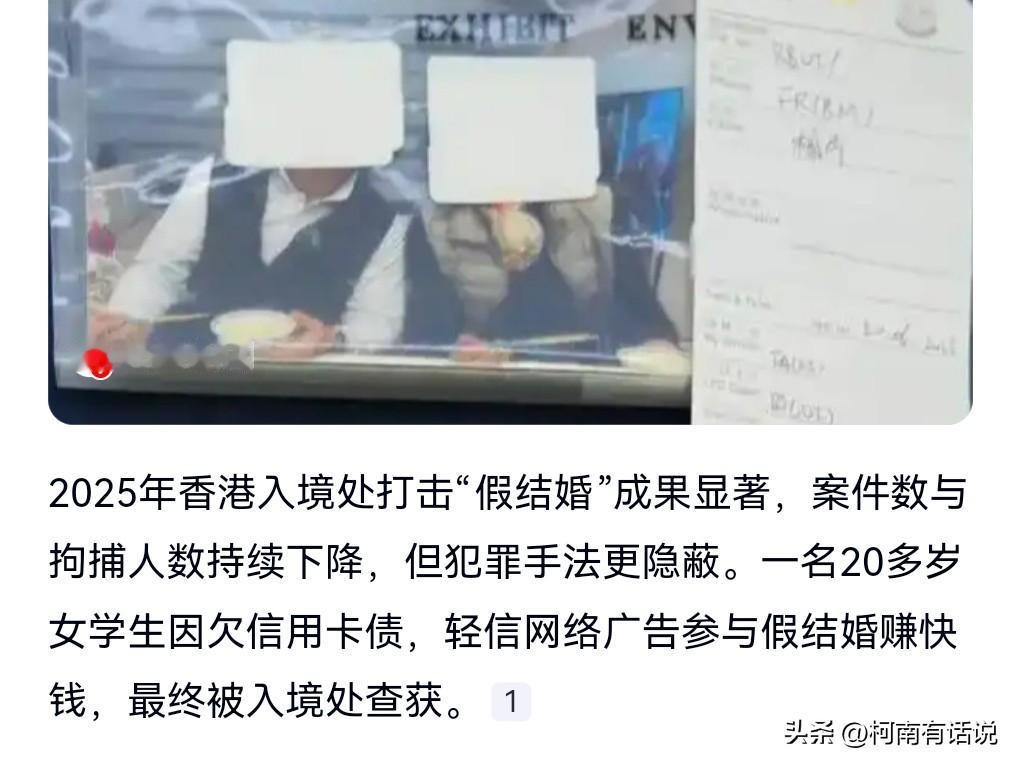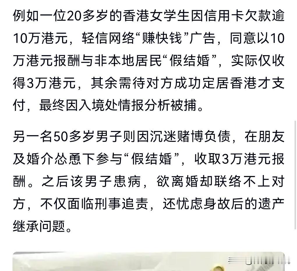 这真的是太没底线了,竟然“假结婚”。 可是法律却不管你是不是出于真实意愿的结婚,结了就是结了,所以说后患无穷。 1月13日热搜。香港女学生为10万港元“假结婚”被抓。 她为了偿还信用卡债,而选择“假结婚”,后来被抓了。 还有一个男子“假结婚”,结果生病了,想离婚,却找不到对方的人了,还有可能面临遗产被继承的局面。 所以这真是敲响了警钟。