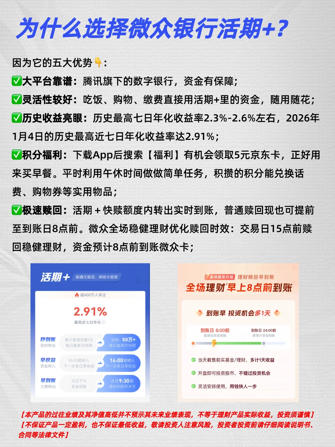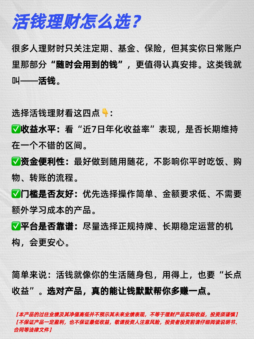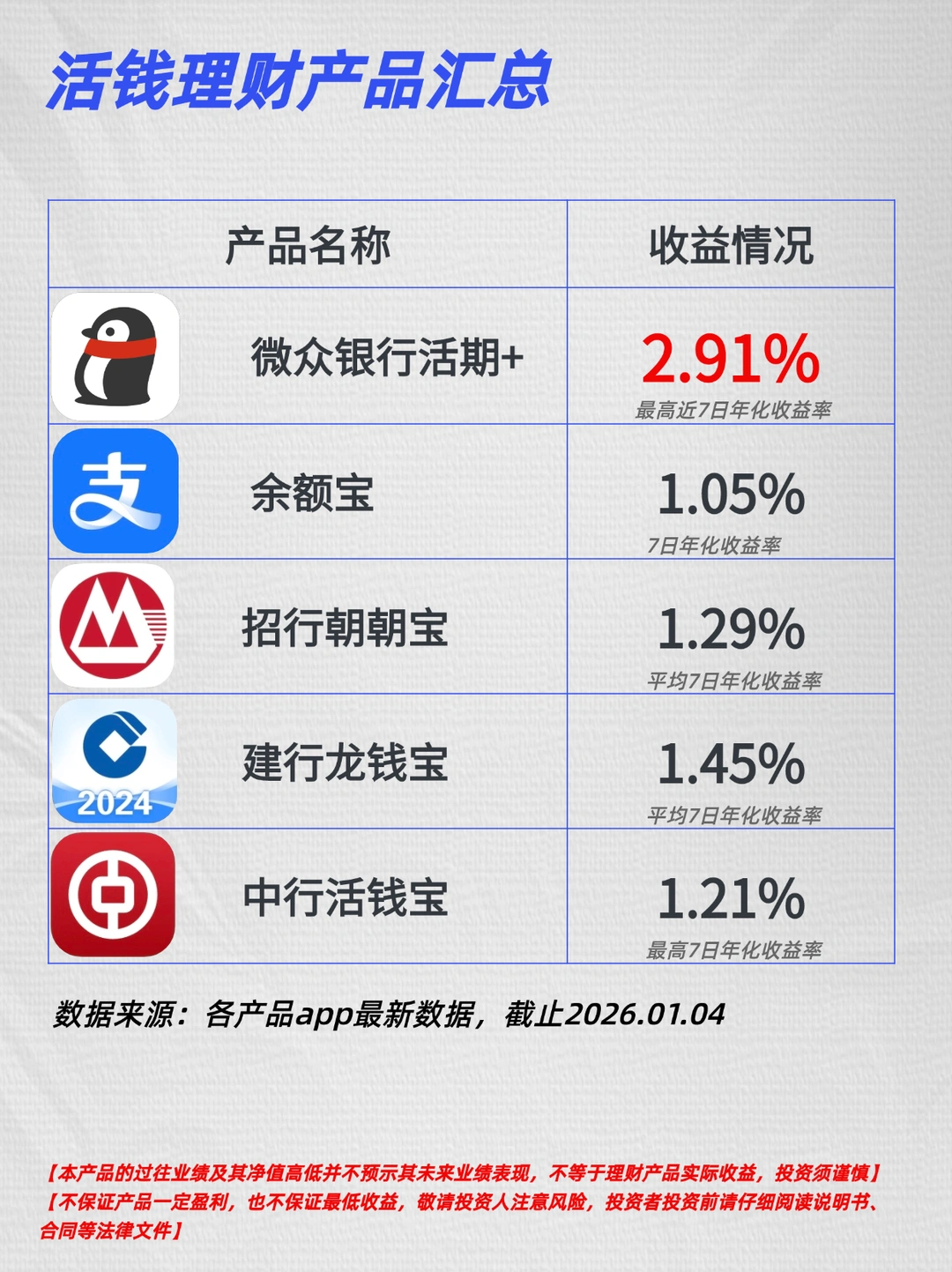 很多人理财时只关注定期、基金、保险,但其实你日常账户里那部分“随时会用到的钱”,更值得认真安排。这类钱就叫——活钱。 选择活钱理财看这四点👇: ✅历史收益:看“近7日年化收益率”表现,是否长期维持在一个不错的区间。 ✅资金便利性:最好做到随用随花,不影响你平时吃饭、购物、转账的流程。 ✅门槛是否友好:优先选择操作简单、金额要求低、不需要额外学习成本的产品。 ✅平台是否靠谱:尽量选择正规持牌、长期稳定运营的机构,会更安心。 简单来说:活钱就像你的生活随身包,用得上,也要“长点收益”。选对产品,真的能让钱默默帮你多赚一点。 活钱理财产品汇总👇 汇总了五家主流银行的活钱理财产品:(数据来源:2026/1/4) 微众银行活期+最高近7日年化收益率:2.91% 支付宝余额宝7日年化收益率:1.05% 招商银行朝朝宝平均近7日年化收益率:1.29% 建设银行龙钱宝平均近7日年化收益率:1.45% 中国银行活钱宝最高近7日年化收益率:1.21% 为什么选择微众银行活期+? 因为它的四大优势: ✅大平台靠谱:腾讯旗下的数字银行,资金有保障; ✅灵活性较好:吃饭、购物、缴费直接用活期+里的资金,绑定微信支付随用随花; ✅历史收益亮眼:历史最高七日年化收益率2.3%-2.6%左右,2026年1月4日的历史最高近七日年化收益率达2.91%; ✅赎回早到账:活期+快赎额度内转出实时到账,普通赎回现也可提前至到账日8点前。微众全场稳健理财优化赎回时效:交易日15点前赎回稳健理财,资金预计8点前到账微众卡。 年初迎新❗️ 2026福马迎新!新开户参与「马到薪安 财富盈门」活动,达标1000财富值就领10元,冲100万直接拿3000元奖励!1.1-2.28限时参与,财富值越高奖励越丰厚~(具体活动规则以页面为准) 【本产品的过往业绩及其净值高低并不预示其未来业绩表现,不等于理财产品实际收益,投资须谨慎】 【不保证产品一定盈利,也不保证最低收益,敬请投资人注意风险,投资者投资前请仔细阅读说明书、合同等法律文件】 微众赎回早到账2026我的新年理财攻略理财存钱微众理财理财微众银行微众银行活期+活期+花60天学理财搞钱