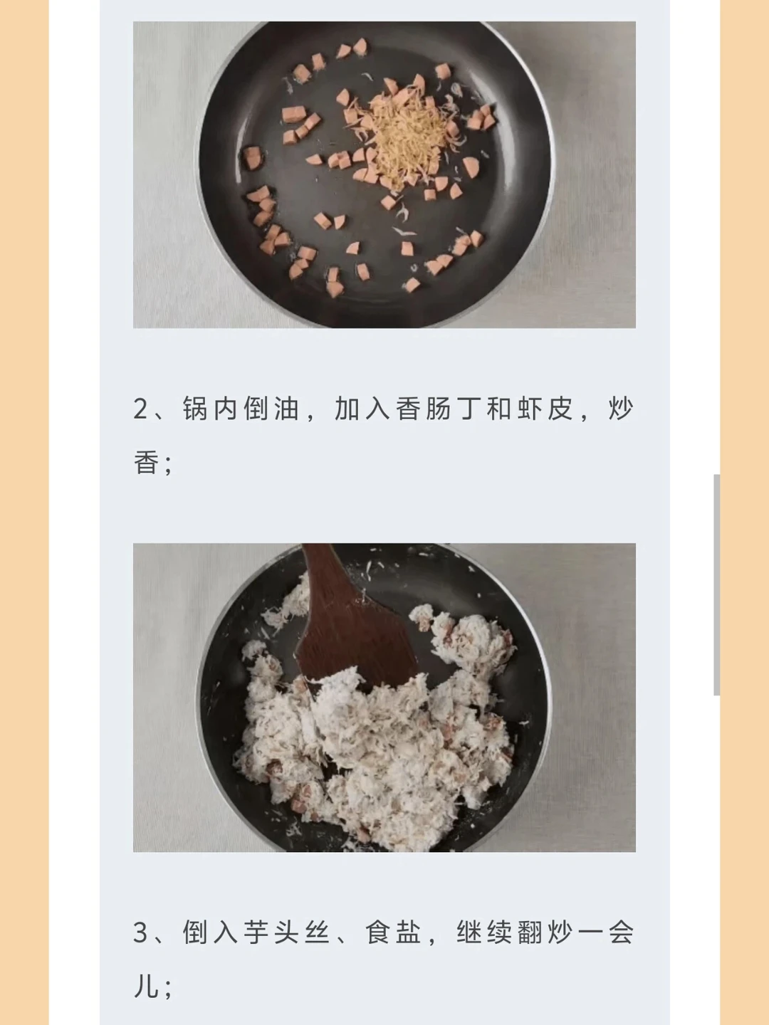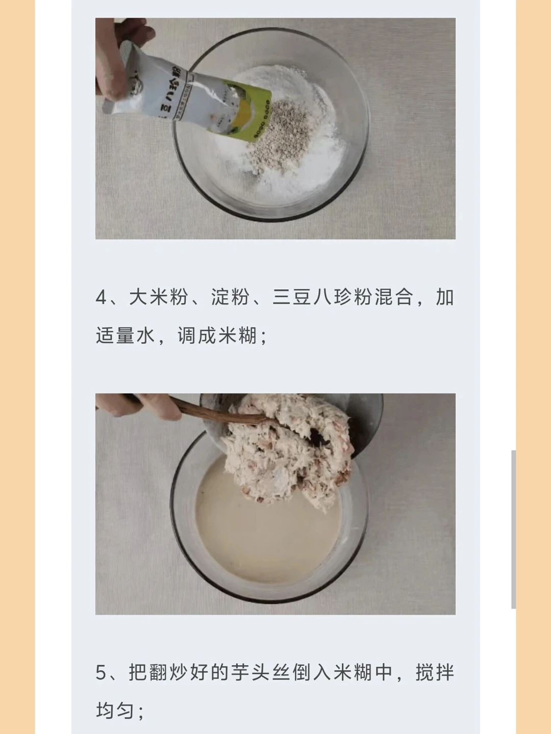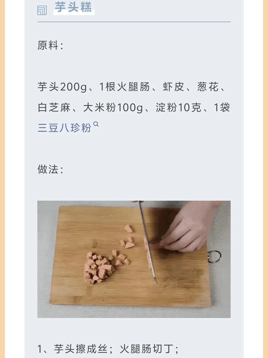 [清单R]原料:芋头200g、香肠适量(注意挑选没有添加剂的)、虾皮、葱花、白芝麻、大米粉100g、淀粉10克、1袋三豆八珍粉