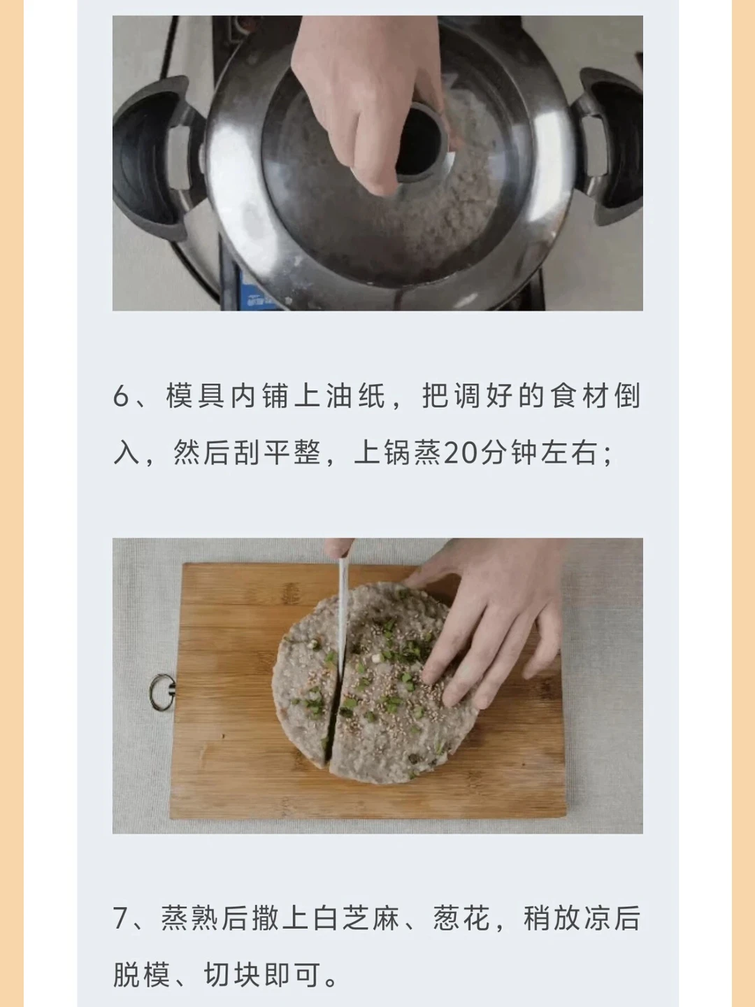 7、蒸熟后撒上白芝麻、葱花,稍放凉后脱模、切块即可。