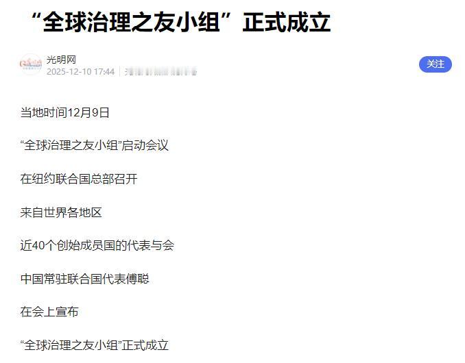 “新联合国”诞生了! 2025年12月9日,中国常驻联合国代表团正式宣布,由我国倡议发起、以全球治理倡议为框架的“全球治理之友小组”正式启动,43个创始成员国齐聚一堂,共赴这场关乎全球治理未来的盛会。 肯定有人会问,这是不是要另起炉灶?压根不是。 这个小组从头到尾都在联合国的框架里做事,核心就是维护二战胜利成果,帮着联合国把作用发挥得更到位,说到底就是想打破少数国家的话语权垄断。 这43个创始国,大多是全球南方国家,以前这些国家被边缘化、诉求没人听,现在终于能拧成一股绳,用一个声音在国际舞台上说话了。 咱们提出的全球治理倡议,那五大核心理念——主权平等、遵守国际法治、践行多边主义、倡导以人为本、注重行动导向,每一条都戳中了当下全球治理的痛点。 尤其是“注重行动导向”,不搞虚头巴脑的口号,就是要真刀真枪解决问题。 这理念刚提出来三个多月,就有140多个国家和国际组织明确支持,足以说明大家有多期待这样的治理方案。 不少国家代表也发自内心地支持这个小组,肯尼亚代表说,倡议的核心理念和联合国宪章宗旨一脉相承,期待一起打造基于规则、和平繁荣的未来; 津巴布韦也表示,这就是全球南方国家想要的公正公平的解决方案;摩洛哥代表更直接,说中国提出这个倡议恰逢其时,肩负起了增强全球南方国家话语权的重要使命。 人心所向,就是这个小组能走得远的最大底气。 可能有人会问,这个“新联合国”到底能发挥多大作用?其实刚成立没多久,它的影响力就显现出来了。 小组成立两天后,在“联合国80周年改革倡议”联大通报会上,中国常驻联合国代表就代表43个成员国作了共同发言。 明确要求改革必须提质增效、重视发展中国家关切、进程要透明包容,这就是实实在在的话语权。 以后在气候资金分配、国际金融调整这些关键议题上,43个国家拧成一股绳,就能逼着少数强国重视咱们的诉求。 更让人振奋的是,这个“新联合国”是开放的,诚邀更多志同道合的国家加入。而且中国不光牵头成立小组,还身体力行地践行多边主义。 就在前不久,中国向联合国秘书长交存了《〈联合国海洋法公约〉下国家管辖范围以外区域海洋生物多样性的养护和可持续利用协定》批准书。 这个历时19年谈判达成的协定,将于2026年1月17日生效,中国也成了缔约方。 咱们还把协定的核心内容纳入了与50多个国家及国际组织签署的海洋领域合作协议,和近20个南方国家建了近30个海洋合作中心、联合实验室。 还通过海洋奖学金招收了325名发展中国家的青年学者来华深造,这些行动都在告诉世界,咱们是真心想推动全球治理朝着更公正合理的方向发展。 2025年12月9日这个“新联合国”诞生的日子,注定会成为全球治理的转折点。 有中国的引领,有成功的实践样板,有实实在在的行动导向,再加上越来越多国家的加入,这个“新联合国”一定能越走越远,为人类的和平与发展贡献真正的力量。 我们有幸见证这个历史性的时刻,也坚信,在它的推动下,世界一定会变得越来越好。
