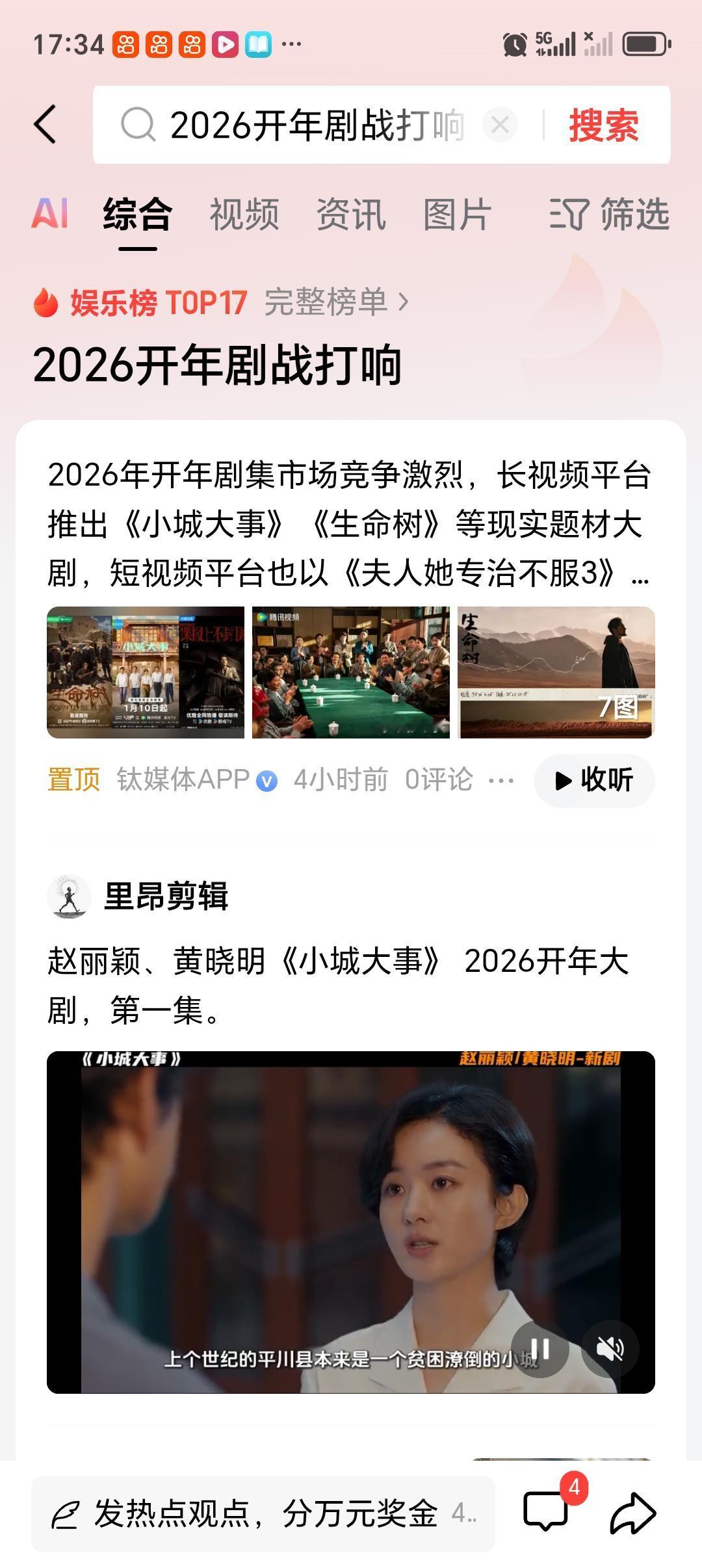 2026开年剧战打响 2026开年剧战打得火热,长视频平台“神仙打架”,短视频也来“虎口夺食”。像《繁花》《人世间》《狂飙》这些现象级大剧都是开年爆款,今年各大平台自然不会示弱。 目前赵丽颖、黄晓明主演的《小城大事》已经开播。它讲的是上世纪80年代干部带领农民在滩涂建城的故事,剧情节奏快,不到两集就定了书记人选。但磨皮滤镜太重,失了年代剧的质感,被吐槽像小品。赵丽颖的演技和台词也遭差评,独白没感情,演讲又像诗朗诵。此外,储备片单里还有《太平年》《生命树》等剧,这“开年首爆”之争够精彩!
