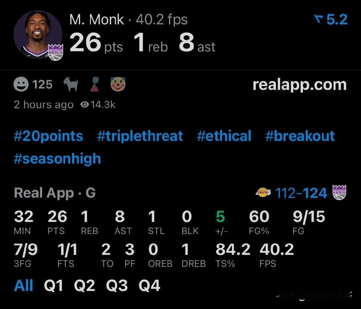 这场球第一功臣是蒙克,26分加全场最多的8次助攻仅有2次失误,三分球9中7 ,关键时刻一个三分+抢断詹姆斯后又助攻阿丘瓦投进三分球,直接大火收汁杀死比赛。