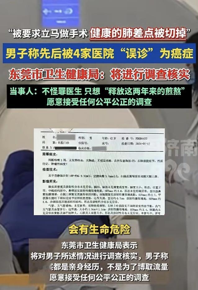 虚惊一场!广东东莞,一男子不停的咳嗽,他到医院一看,医生说他得了癌症,要他立刻进行手术,男子害怕,连续跑了4家医院,无一例外,医生都说他是癌症,男子绝望,这才决定去做手术,术前拍了加强ct,谁知医生一看检查结果: 你肺上干干净净,啥都没有,为何要住院做手术? 这世上最大的黑色幽默,莫过于你已经把自己的人生做好了清算,连最后的告别词都打好了腹稿,结果命运突然把那张“死亡通知单”给撕了。 广东东莞的陈先生就遭遇了这么一出荒诞剧,他在生与死的边界线上反复横跳,硬生生把一场医疗悲剧演成了令人后怕的悬疑片。 事情得回溯到2024年的开端,起因不过是很多人都会忽略的生理杂音——咳嗽,但这几声咳嗽,最后竟演变成了一场针对他肺部的“联合围剿”。 当第一家医院给出一纸“疑似恶性”的判决书时,其实只是推倒了第一块多米诺骨牌,可怕的是后续的连锁反应。 为了推翻这个要命的结论,陈先生像是着了魔一样,辗转于不同的医疗机构之间,试图寻找哪怕一丝“误判”的可能性。 然而,医疗体系内部有时存在一种诡异的“回声室效应”,当先入为主的观念形成,后续的诊断往往容易陷入同一条逻辑沟壑。 接连几家医院的专家,像是商量好了一样,众口一词地维持原判,这一致性直接击碎了陈先生最后的心理防线。 这里面最讽刺的一笔开销,是为了确诊而砸进去的昂贵检查费,那项被视为高端医疗“金标准”的PET-CT技术,这次却成了最大的谎言制造机。 那台价值不菲的机器扫视过他的胸腔,捕捉到了异常的高代谢信号,却没能分清这到底是死神留下的印记,还是一场普通炎症燃烧后的余烬。 那一刻,高科技的数据背叛了真相,把一个普通的肺部疤痕,渲染成了直径接近两公分的“夺命符”。 在绝大多数人眼中,四家医院的交叉验证,加上昂贵仪器的铁证,这基本上就是铁案如山,陈先生彻底绝望,开始着手处理身后的遗产分配。 这不仅是对命运的低头,更是一个成年人在绝境中试图保全家庭利益的最后理性,他甚至规划好了手术后的凄惨余生。 就在手术刀即将切开胸膛的前夜,命运的齿轮被一颗不起眼的小石子卡住了,一位并未处于核心决策圈的助理医生,成了那个破局者。 这名年轻医生在进行术前最后的例行核查时,没有被那一摞厚厚的“确诊报告”遮蔽双眼,而是死盯着那张最新的加强CT片子看出了端倪。 在他眼里,那些被权威专家定性为恶性肿瘤的阴影,纹理走向居然透着一股“良性”的秩序感,怎么看都像是炎症消退后的纤维化遗迹。 当“肺部干干净净”这几个字从医生嘴里蹦出来时,陈先生大脑的第一反应恐怕不是狂喜,而是某种认知体系崩塌后的剧烈眩晕。 这意味着,之前所有的恐惧、花费的巨资、流干的眼泪,以及那四家医院信誓旦旦的诊断,全都是一场建立在误解之上的虚幻泡沫。 那份最终签署日期为2024年3月18日的报告,上面清清楚楚写着的“未见异常”,简直是对之前那套繁琐医疗流程的一记响亮耳光。 直到2025年年底,陈先生才鼓起勇气把这段经历通过视频公之于众,这中间漫长的沉默,大概是他消化这场“虚惊”所必须付出的时间成本。 当地卫健局在2026年1月迅速做出反应,表示要介入核查,这不仅仅是为了给陈先生一个说法,更是为了修补公众对诊断体系的信任裂痕。 这个案例最让人背脊发凉的地方,不在于误诊本身,而在于误诊所展现出的那种“系统性惯性”,当第一个扣子扣错,后面居然没人发现。 那所谓的“恶性结节”,说白了就是肺部受伤后结的一个疤,就像皮肤上的伤口愈合后的痕迹,却被过度解读成了致命的癌变。 假如没有那位助理医生在最后一刻的“较真”,陈先生失去的将不仅仅是一块健康的肺叶,还有他对生活全部的热情和原本完整的身体机能。 这也给所有人提了个醒,在面对这种关乎生死的重大博弈时,所谓的“权威共识”有时候也需要打个问号,多一双不受干扰的眼睛,或许就能救回一条命。 在这个充满不确定性的生物迷宫里,最高级的仪器也可能看走眼,最终能以此破局的,依然是医生那颗不肯盲从、敢于推翻前论的责任心。 如今陈先生虽然毫发无损地回到了正常生活的轨道,但这笔差点被强行划走的“生命坏账”,足以让我们重新审视每一次医疗决策背后的风险权重。 信息来源:男子自述先后被4家医院误诊癌症,当地卫健局回应:将进行核查,男子:不是博流量,接受任何公平公正调查,2026-01-12 14:16·观威海