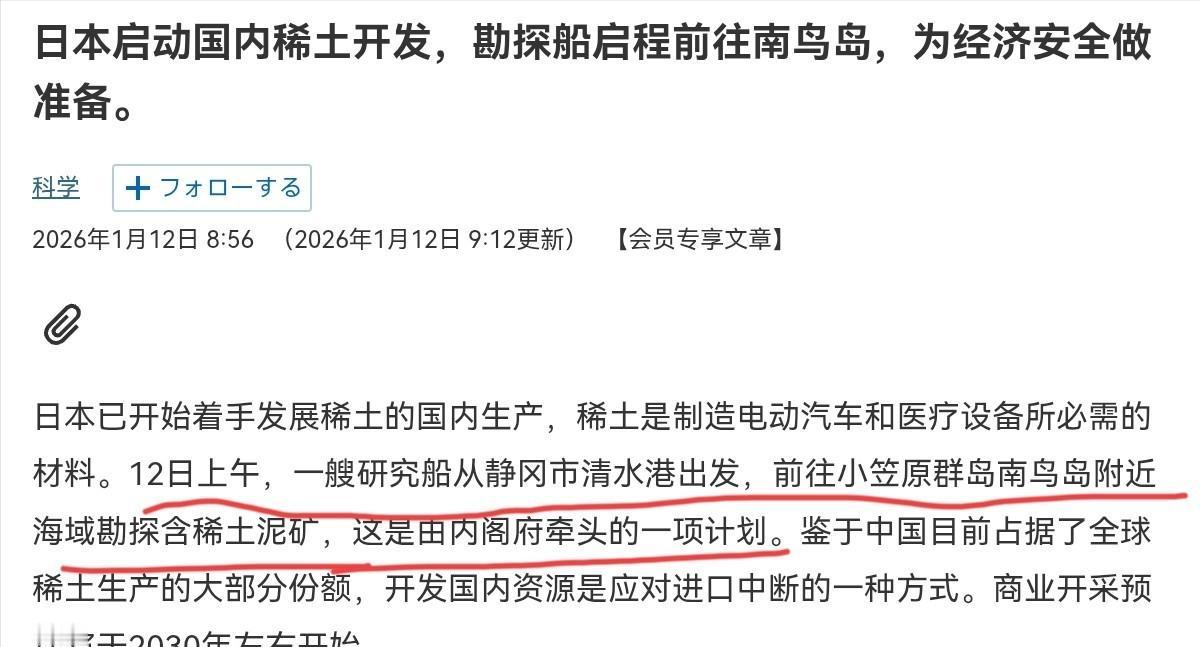 日本态度已明,不会指望中国,日本国内有动作了!1月12日,根据日经新闻报道,就在高市早苗公开表示中国的行为不可接受,管制行为只针对日本之后,日本国内已经有动作了。日媒称,12日上午,一艘日本研究船从静冈市清水港出发,前往小笠原群岛南鸟岛附近海域勘探含稀土泥矿。 高市早苗口中“不可接受的中国管制行为”,是中方1月6日发布的对日两用物项出口管制公告。 公告明确禁止两用物项对日本军事用户、军事用途出口,也禁止助力日本提升军事实力的相关出口,涵盖高性能复合材料、精密机床、稀土制品等数百个军工核心品类,精准命中日本产业命脉,尤其是稀土管控,直接戳中其要害。 稀土管控之所以让日本紧张,核心是其对中国稀土的高度依赖。数据显示,日本目前超70%的稀土、100%的重稀土依赖中国进口。 稀土被称为“工业维生素”,不仅民用领域离不开,更是雷达、制导系统等军工装备的核心材料。 而中国掌控着全球85%的稀土冶炼分离产能和高端稀土制品产量,日本多数企业的稀土库存仅够维持72小时,供应中断将直接导致产业停产,这正是其急于启动国内勘探的关键原因。 此次日本派出的“地球号”研究船,承担着全球首例6000米深海稀土试采任务。据日媒披露,该船从清水港出发后,需一周抵达距东京2000公里的南鸟岛海域,开展为期20天的采掘实验,目标是获取6000米深海泥样本验证可行性,任务将持续至2月14日。 日本选择此处,是因2012年便发现高浓度稀土泥层,储量超1600万吨,其中铽、镝储量可满足全球数百年需求。项目负责人直言,行动核心是推动稀土来源多元化、实现国产化,若实验成功,2027年2月将启动商业采矿。 但日本的深海开采计划看似雄心勃勃,实则困难重重。一是技术瓶颈,6000米深海550个大气压的环境让设备故障风险极高,日本自2012年发现矿藏至今,相关技术十余年仍未攻克。 二是成本高企,深海开采成本是陆地的10倍以上,加之南鸟岛距本土遥远,运输和处理成本居高不下,构建经济供应链难度极大。 三是生态与法理争议,深海采矿会破坏海底生态,且国际海底管理局尚未出台相关全球规范,试采面临双重拷问。 日本此次动作是对中方管制的系统性回应。“地球号”启航前一天,日本财务大臣便赴美国协商关键矿产问题,试图构建多边稀土供应联盟。 此外,日本还计划5年投入3万亿日元打通中亚至欧洲物流通道,联合法国建稀土回收工厂,发力提炼技术突破中国产业链优势。 这背后是其对产业安全的极度焦虑,据测算,若中国稀土供应长期中断,日本实际GDP或降1.3%至3.2%,制造业产出降超5%,汽车行业降幅可能达17.6%。 需明确的是,中方管制并非无端打压,而是对日本危险行为的正当回应。近年来,以高市早苗为代表的右翼政客频繁抛出“台湾有事就是日本有事”等言论,挑战中国核心利益。 同时日本不断扩军,2026财年防卫预算达9.04万亿日元,较2018财年增幅70%,还推动修订“安保三文件”、取消武器出口限制,暴露“再军事化”野心。中方管制是用国际通行规则阻断其军国主义复活的技术可能,且不影响民用贸易,完全合理克制。 回到日本的深海勘探计划,即便试采成功,实现商业化开采、摆脱对华依赖至少还需十年。期间全球稀土产业链格局难改,中国的综合优势仍占主导。 日本“稀土自主”存在逻辑漏洞,即便开采出稀土泥,后续精炼提纯仍依赖成熟产业体系,这正是其短板。 此次派船出海更多是政治姿态,试图传递“不依赖中国”的信号,但现实的产业依赖和技术瓶颈,绝非一次勘探就能解决。 未来一两个月,“地球号”试采进展将成国际焦点,结果直接影响日本后续稀土战略。但无论结果如何,中日产业博弈已进入深水区,稀土作为核心资源必然是博弈关键。 对日本而言,与其搞“脱钩断链”,不如正视自身错误,回到对话协商轨道;对我们来说,这场博弈也再次证明,掌握核心产业链主动权,才是应对地缘政治风险的底气。