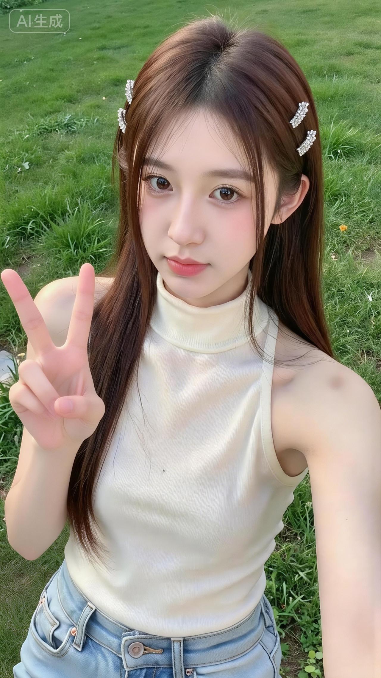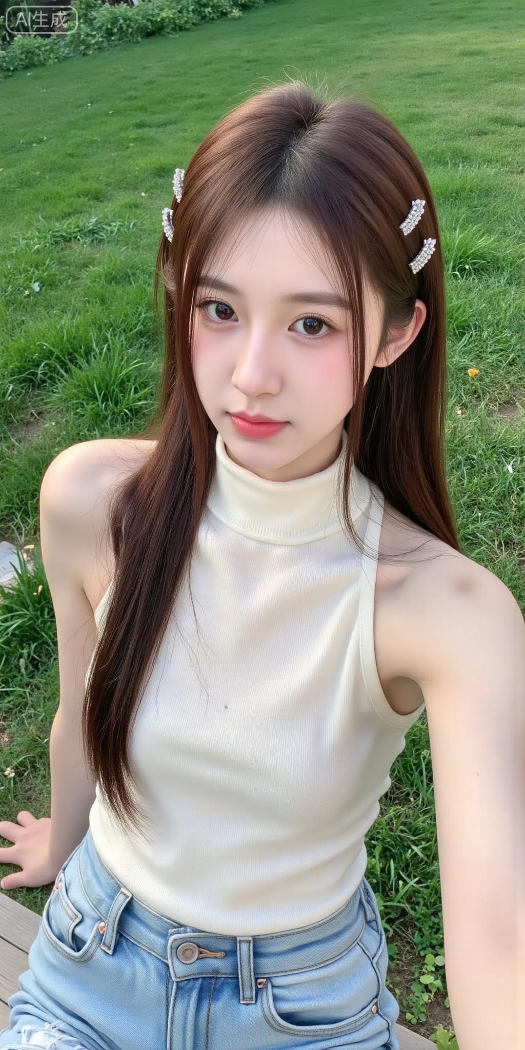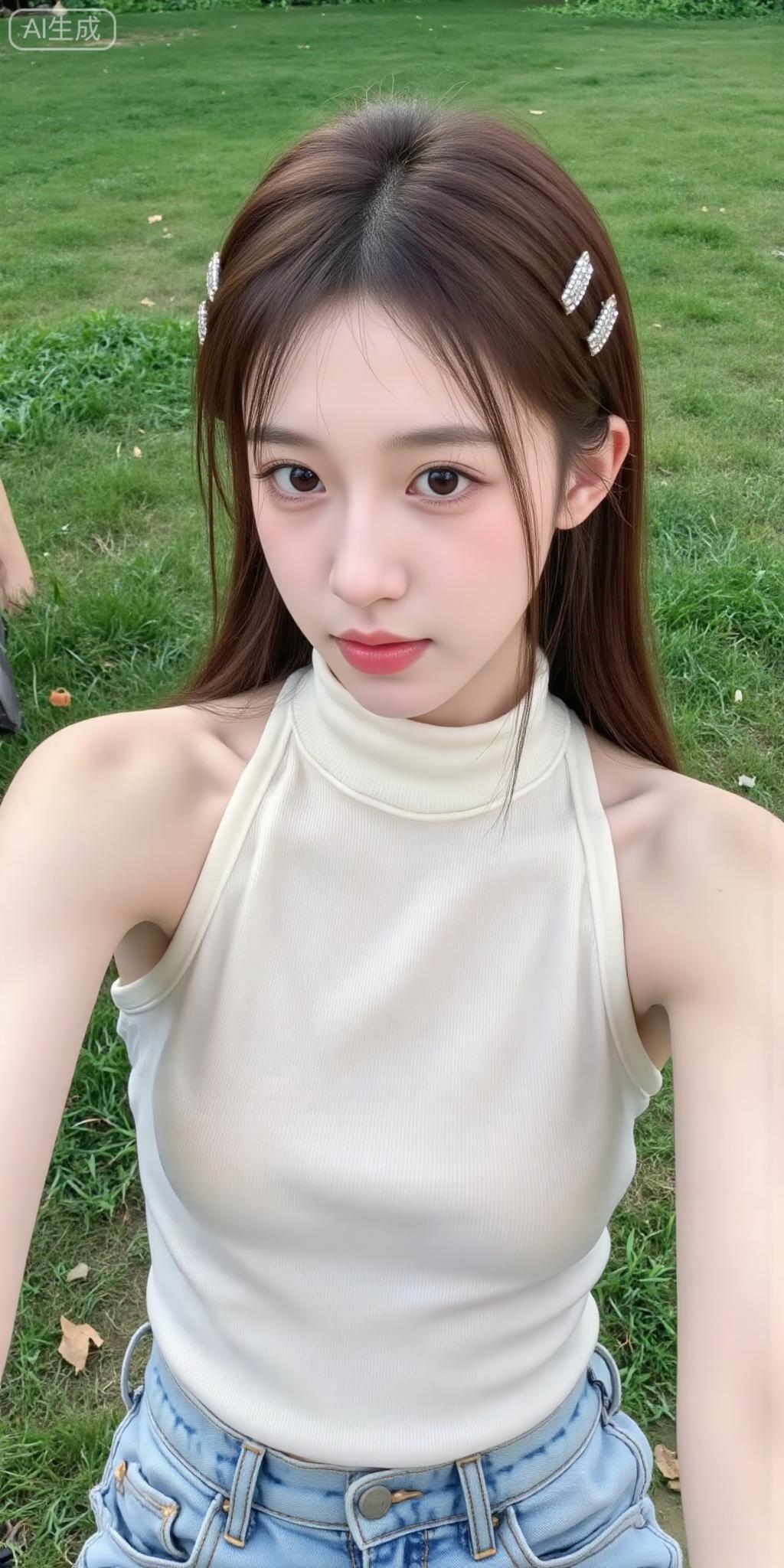 草坪上的清透系甜妹 米白挂脖衫配浅牛子裤,干净得像揉碎的阳光~发间钻夹添了点精致,连草地碎叶都成了她的松弛滤镜✨ 是把“日常氛围感”焊在身上的妹妹!米白气质上衣