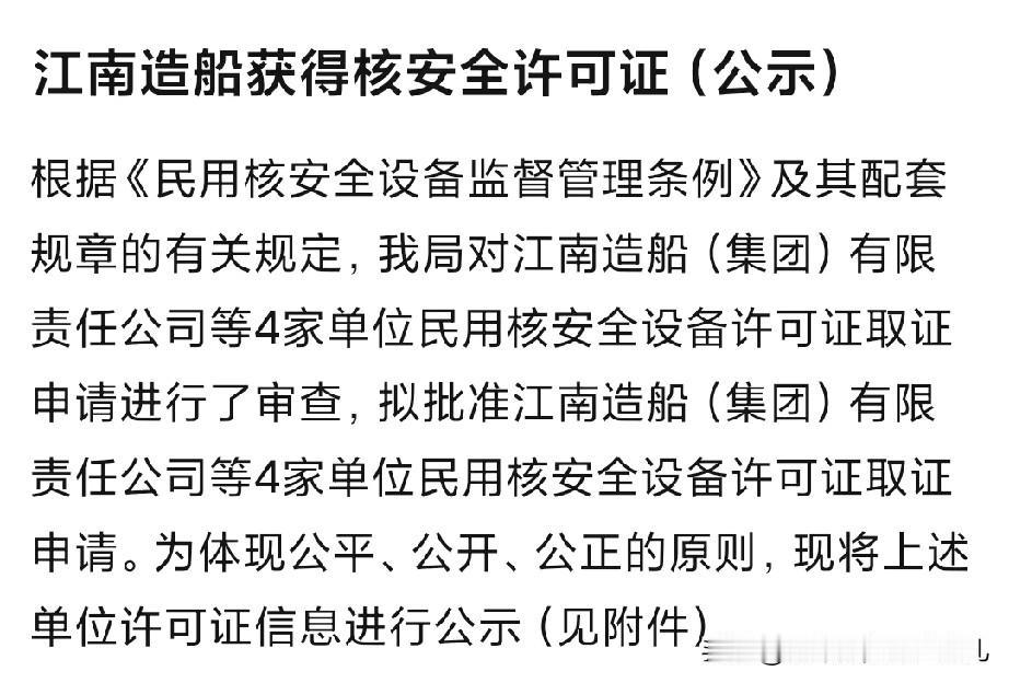 江南造船拿下关键安全证,双线开工稳了! 江南造船刚拿下的这个安全许可证可不一般,妥妥是中国高端动力装备领域的硬突破,接下来就能和达利安船厂并肩干活,实现双线开工了。 要知道这证的门槛高到离谱,能拿下就说明企业在安全设计、制造工艺和质量把控上都过了硬关,民用领域都能做到这份上,军用层面的技术衔接肯定没毛病。 关键是这类船用动力的核心资源要求特严,纯度得冲到90以上,一直都是专门部门统筹负责。这次突破让中国造船业彻底跳出传统商船的圈子,往高附加值动力装备领域冲,不管是特殊动力船舶还是海上相关动力平台,后续都能稳步推进,对提升远海保障极有帮助。