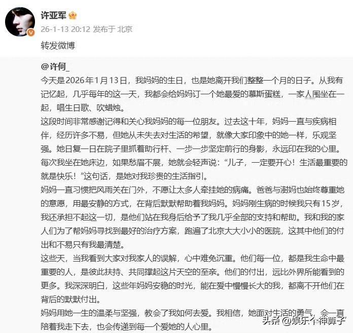 儿子许何发文缅怀何晴,力挺爸爸许亚军! 1月13日,何晴冥诞这一天,儿子许何在