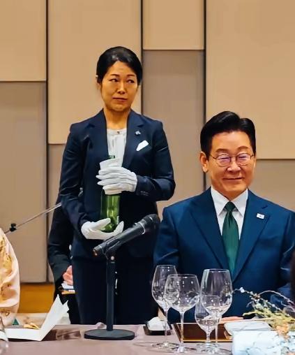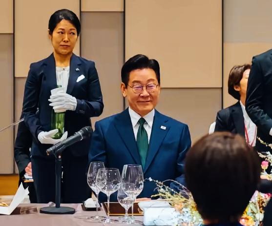 李在明身旁工作人员眼神是在暗示什么意思呢? 手里拿的是酒吗? 这是通过眼神在沟通需要给李在明倒多少酒吗? 通过眼神作为交流暗语吗?