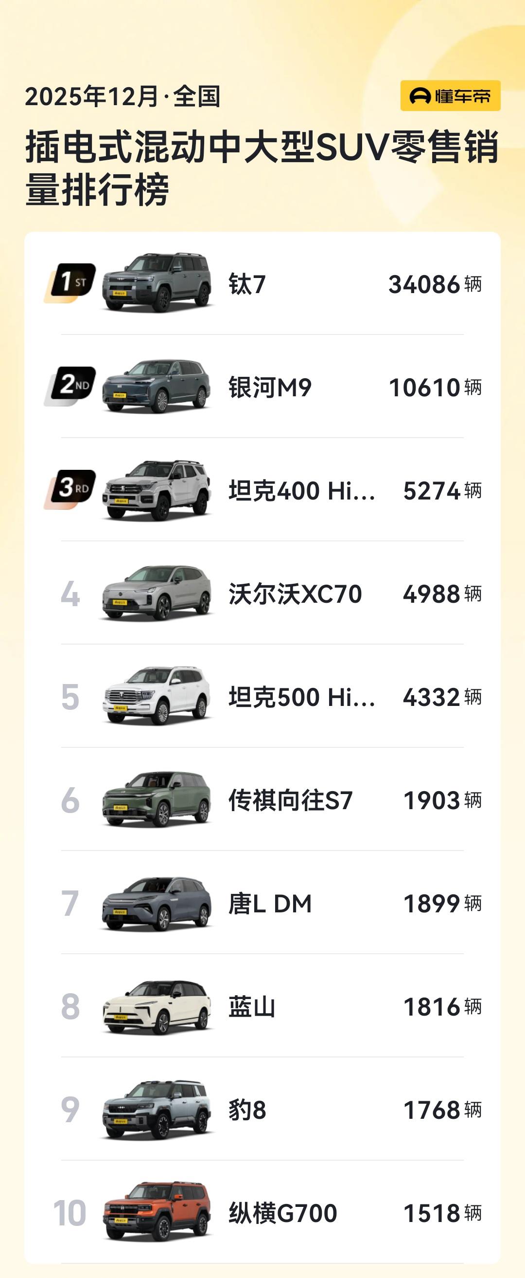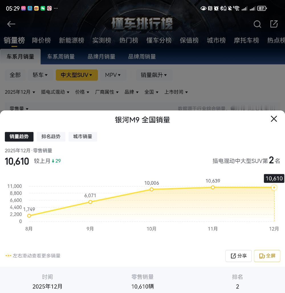 孙少军:吉利银河M9连续3个月新车销量过万! 去年出了那么多6座SUV,吉利银河M9依然从惨烈的市场杀出来了。 吉利银河去年每个都是爆款,且都是在主流市场,这点真的很强。 小编认为这款车还是定价合理,在20万元这个价位区间,确实非常缺乏混动的车型尺寸又有非常大的车型。方程豹钛7每个月能卖这么多,也是因为定价偏低,20多万元的售价就能让消费者拥有一个大尺寸的车。 在20万元这个级别,大尺寸的混动车有非常大的产品空间,因为绝大多数车企都是在卷30万元以上的市场,20万元这个市场目前还是属于比较空白的。 各位是怎么看的?欢迎评论区留言。