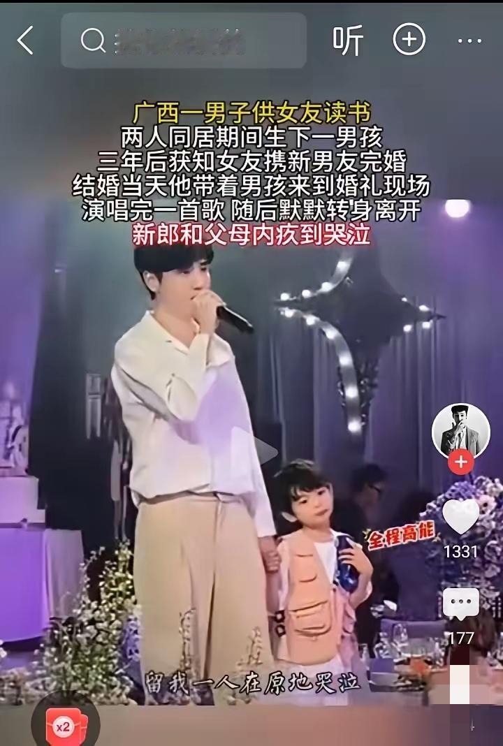 广西一男子供女友读书,同居期间生下一个男孩。三年以后,女友和新男友结婚,当天男子带着孩子,来到婚礼现场唱了一首歌,带着孩子默默离开。 别觉得他懦弱,这才是最体面的反击。没哭闹没撕扯,没让孩子在众人面前难堪,也没毁掉那个女人的“幸福”时刻。他用一首歌告别过去,也给这段错付的感情画上了句号。 有人说他傻,付出这么多最后一场空。可我觉得,他的傻里藏着善良,他的放手不是认输,而是为了孩子,选择扛起责任重新开始。那些错付的真心,总会在往后的日子里,被孩子的笑容慢慢治愈。 你觉得这个男人的做法值得吗?