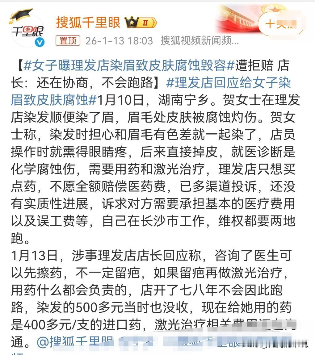 这真的是太可怕了,女子实在是太倒霉了,染个眉毛竟然皮肤毁容了。 1月10日,湖南宁乡,女子理发店染眉致皮肤腐蚀毁容。 想不到腐蚀性这么强,实在是太可怕了,当时熏的就眼睛疼,后来直接掉皮了。 这个要激光治疗,但是这个门店只想赔一点医药费。 那肯定是不能让女子满意的。 1月13日店长回应称不会跑路。
