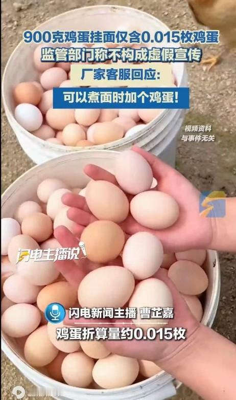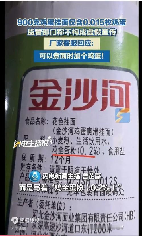 900克鸡蛋挂面仅含0.015枚鸡蛋!厂家客服:可以煮面时加个鸡蛋! 所以说,鸡蛋挂面的意思是下挂面的时候要加鸡蛋,不是挂面里有鸡蛋! 你看,人家至少里面含了鸡蛋,至于含了多少,这个不重要,就像6个核桃,他就是是个商标! 厂家的回应确实高!就如同千禾0添加酱油被回应为千禾0添加牌!不管你信不信,反正监管是信了的。 其实,鸡蛋真不是很贵的东西,超市里三块多钱一斤,一个鸡蛋不到5毛钱,一包面条450g,200包面条,才加一个鸡蛋!这个成本可以忽略不计,鸡蛋就不用写出来当噱头了吧! 家庭挂面 挂面配料表
